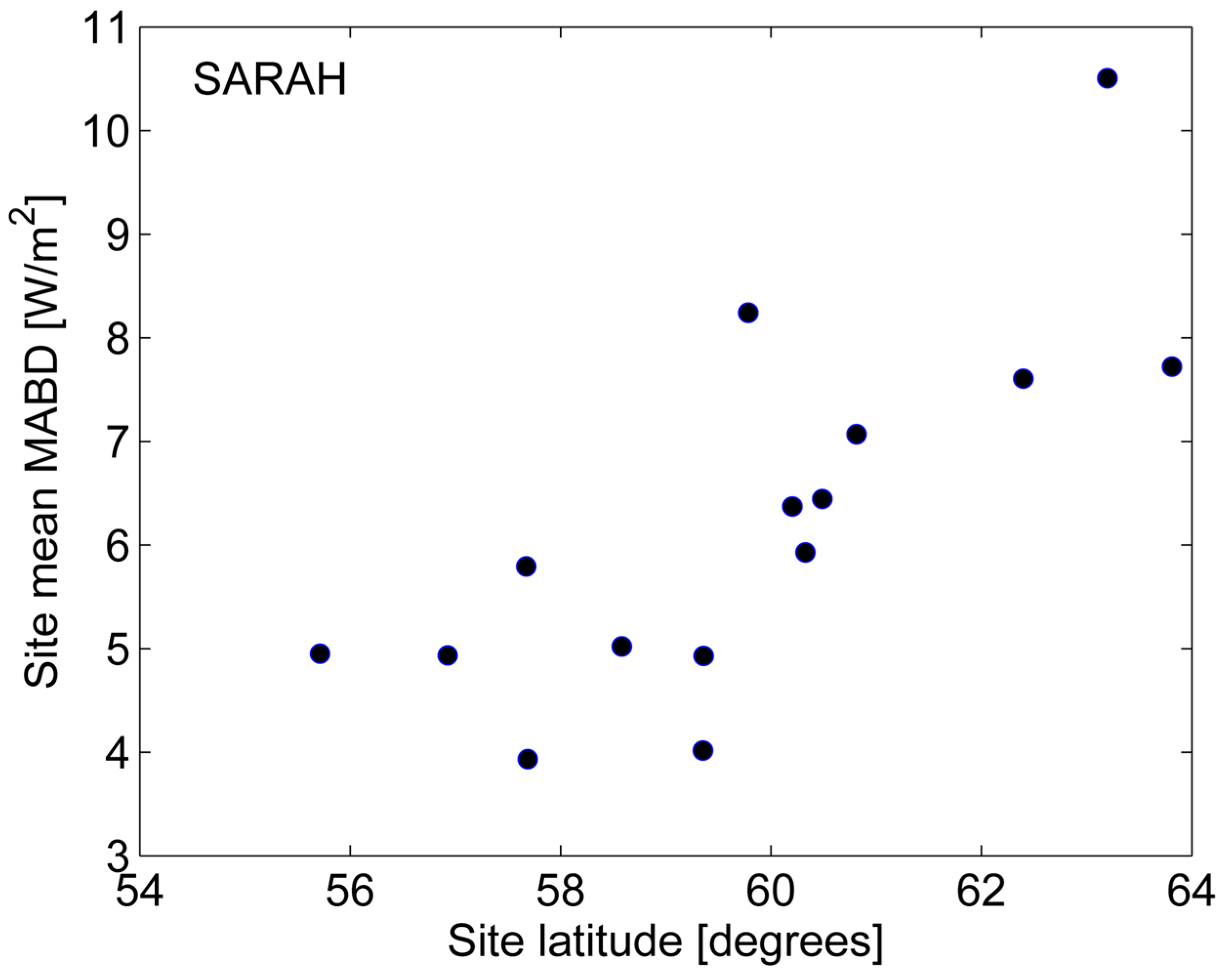 The correlation of anomalies between the SARAH and the CLARA results are very similar. The sites showing the largest retrieval biases are different in the datasets; for CLARA, Göteborg showed largest retrieval errors, whereas for SARAH the largest bias sites are Östersund and Umeå. Noting that these sites are also the northernmost in this study where SARAH has coverage, we examined the retrieval bias (MABD) as a function of site latitude.