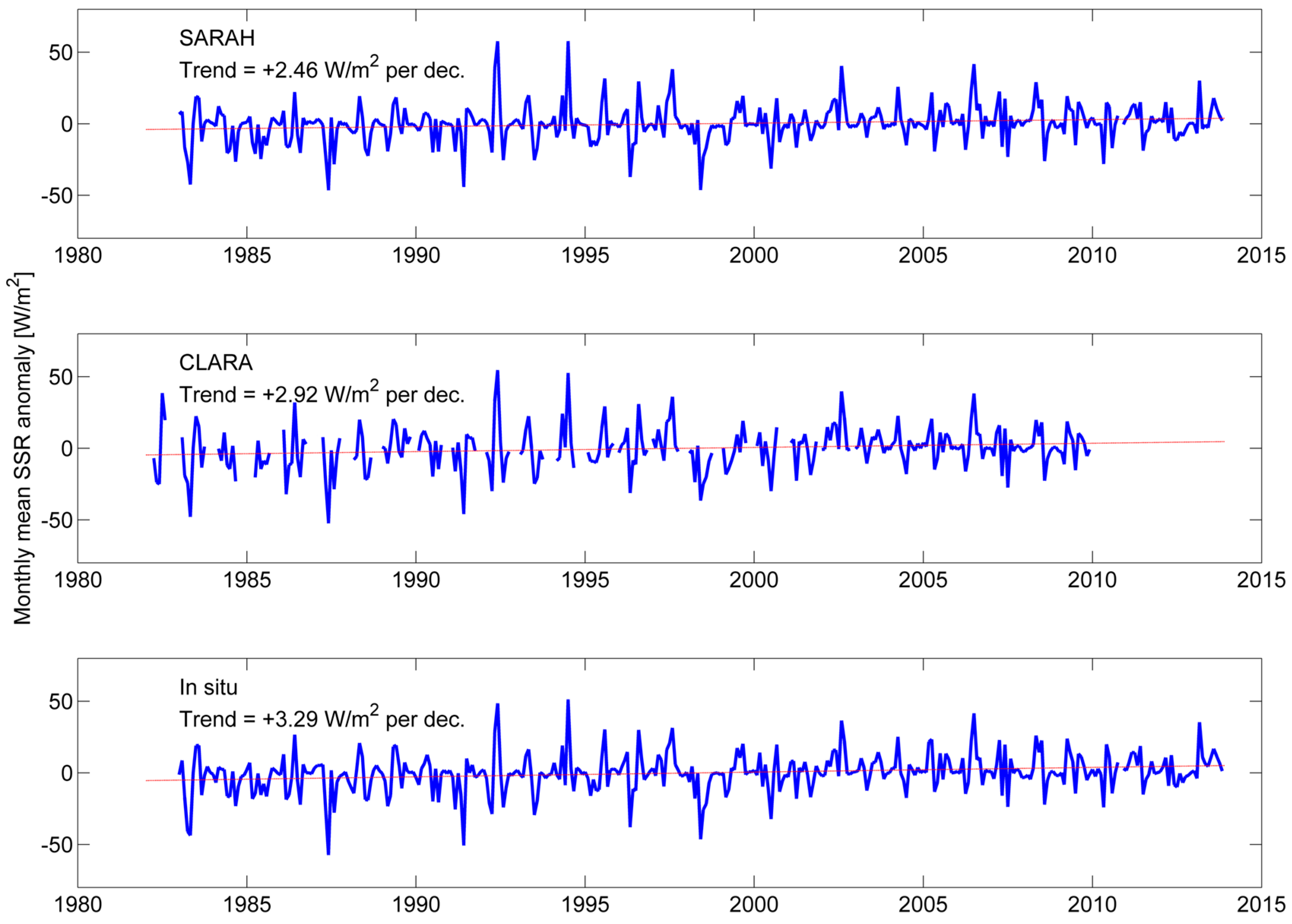 Figure 7) clearly indicate that Northern Europe has followed the continuous brightening trend reported for the whole Europe since the 1980s. The trends seen in SARAH and CLARA-A1 for this region are also stronger than the global SSR trends reported by Pinker