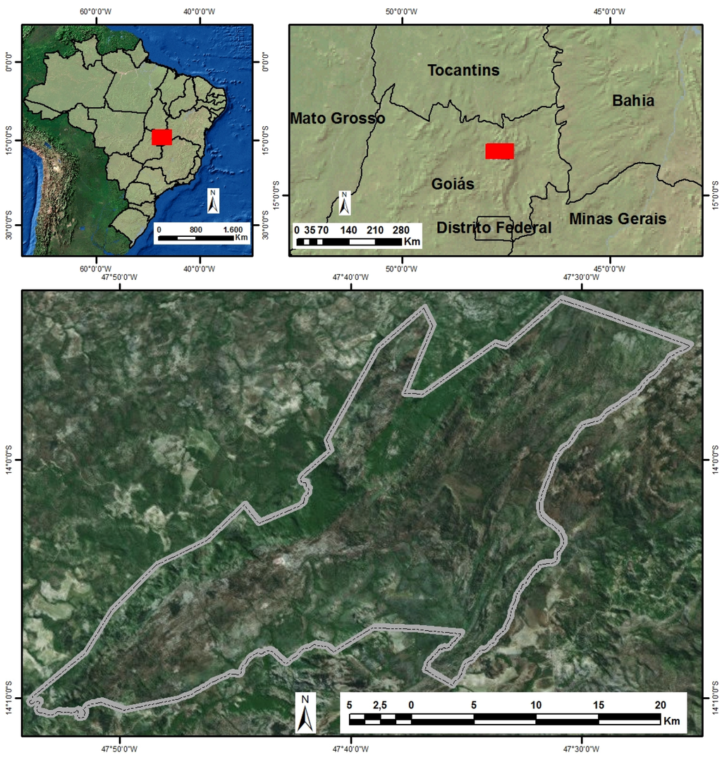 The study area is the Chapada dos Veadeiros National Park (CVNP) (655 km2) located in Central Brazil. This park was included in the World Heritage List by UNESCO in order to preserve the flora, fauna and key habitats that characterize the Brazilian Savanna (Figure 1).