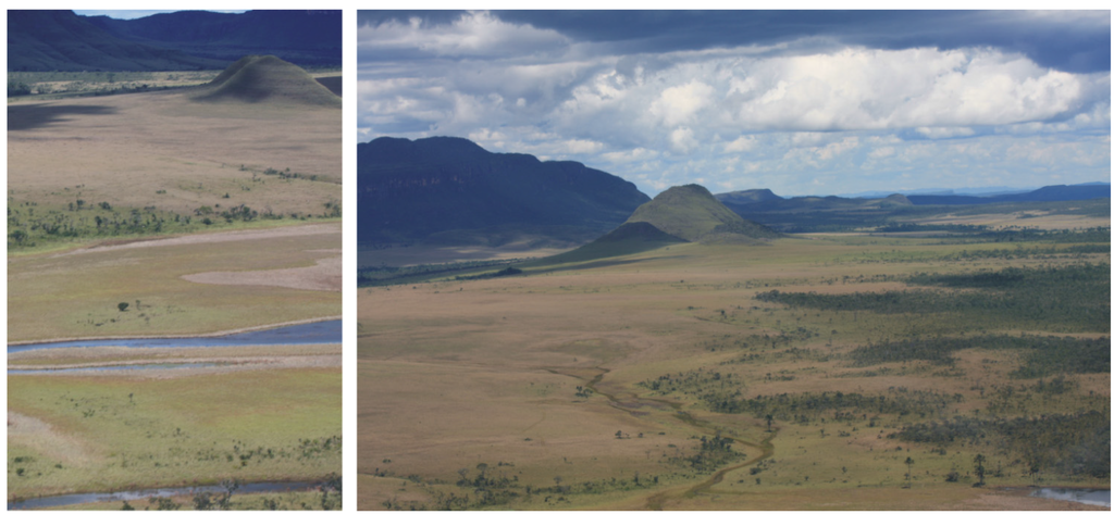 Panoramic photographs of the open grasslands in the Chapada dos Veadeiros National Park.
