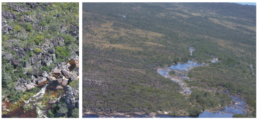 - Carvalho Junior, O.A.; Guimarães, R.F.; Martins, E.S.; Gomes, R.A.T. Chapada dos Veadeiros: the highest landscapes in the Brazilian Central Plateau. In Landscapes and Landforms of Brazil, Series: World Geomorphological Landscapes, 1st ed.; Vieira, B.C., Salgado, A.A.R., Santos, L.J.C., Eds.; Springer: Dordrecht, The Netherlands, 2015; Volume 1, pp. 221–230. [Google Scholar]