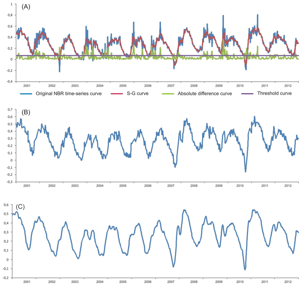 Procedures for reconstruction of a NBR-MODIS time series using two-step filtering approach through the S-G method. (A) Outlier detection using the absolute value of the difference between the original data and the S-G curve (distance threshold of 0.07). (B) Time-series curve with the outliers replaced by a linearly interpolated value. (C) Time-series curve after the second filtering by S-G method (window size of 9).