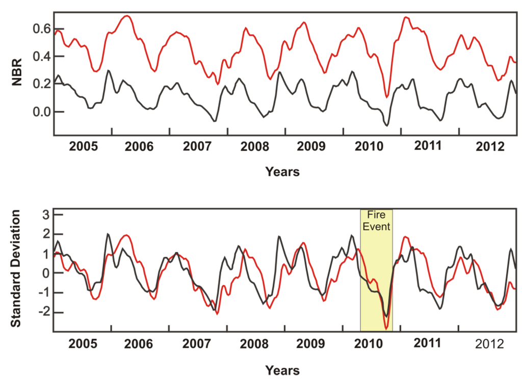 NBR-MODIS time series of savanna (black curve) and Closed Savanna Woodland (red curve) before and after the standardization. The standardized temporal curves homogenize and highlight the fire event, which reached different types of vegetation.