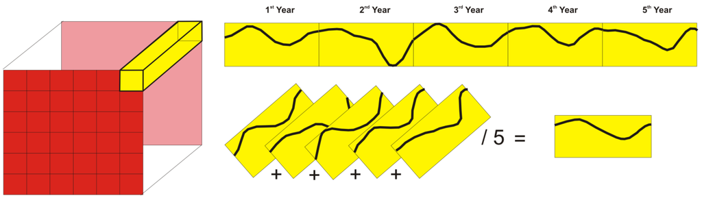 Procedure for calculating the interannual trimmed mean curve, considering one pixel and five years.