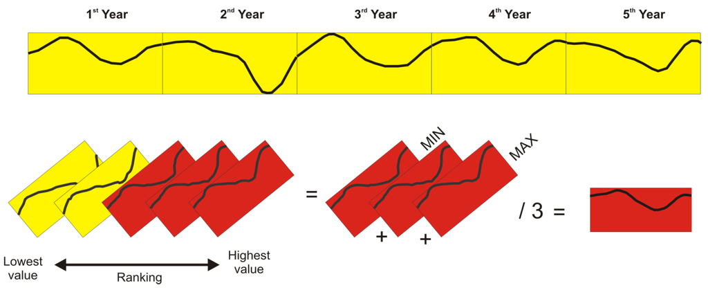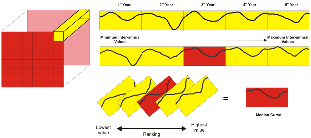 The median is known for being particularly effective in removing changes of short duration. The median is a particular case of the ith order statistic (or rank statistic) of a finite set of real numbers. Arranging all the observations from lowest to highest value, the median value is the middle one. Considering an order statistic of N real numbers (x(i)...,x(N)), where N is number of years, the minimum is then x(1), the maximum x(N), and the median X((N + 1)/2). The calculation of the interannual median is performed separately for each eight-day period in the several studied years. In this way, the method initially gathers the first 8-day period of every year (e.g., 1st 8-day: 2001; 1st 8-day: 2002, etc.) and calculates the median, which is contained in the first band of the result image. Then, the same procedure is performed for the second 8-day period (e.g., 2nd 8-day: 2001; 2nd 8-day: 2002, etc.) composing the second band, and so forth. Therefore, the z-profile from median interannual image has the same dimension as one particular year (Figure 8). The implementation of a median requires a very simple digital nonlinear operation. In this case, if the fire events are present in a few years over a time series, the median can eliminate their influence.