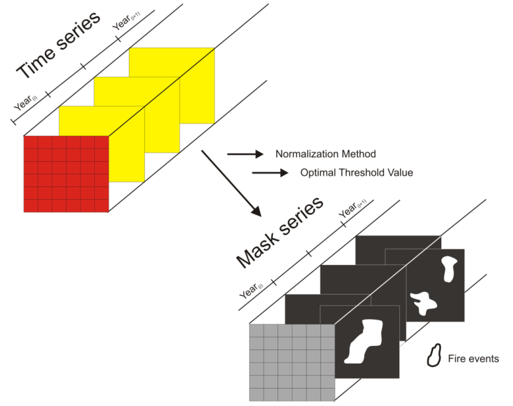 Typically, the processing for the burned area detection is a combination of a spectral index and a data normalization using seasonal differencing. Many studies focus on the comparison between spectral indices (e.g., NBR, NDVI, among others). However, the seasonal difference method applied to long-term measured time series is very susceptible to false positives errors from the mismatch between the successive annual phenological curves. Therefore, a sharp fall in the dNBR occurs at various points of the temporal curve that are not related to fire events. Despite the problems created by the seasonal difference, no other normalization method has been proposed.
