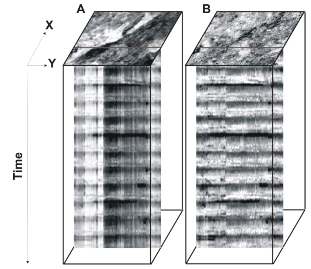 The standardization of the time series for each pixel reduces the differences between vegetation types and highlights the episodic fire events. Z-score model provides a measure in relation to its mean expressed as a percentage of the standard deviation. Figure 11 compares the original and standardized images and its respective horizontal slice images. Horizontal slice image combines spatial and temporal profile of a multi-band image, where all the bands of a single line make up a grayscale image in which the number of bands is equal to the number of lines. The slice image from the NBR image shows a strong differentiation between areas with forest formation (highlighted in light tones) and the savanna and grassland formations (with darker tones) (Figure 11A). In contrast, the slice image of standardized data has seasonal variations as the main tonal variation (Figure 11B).