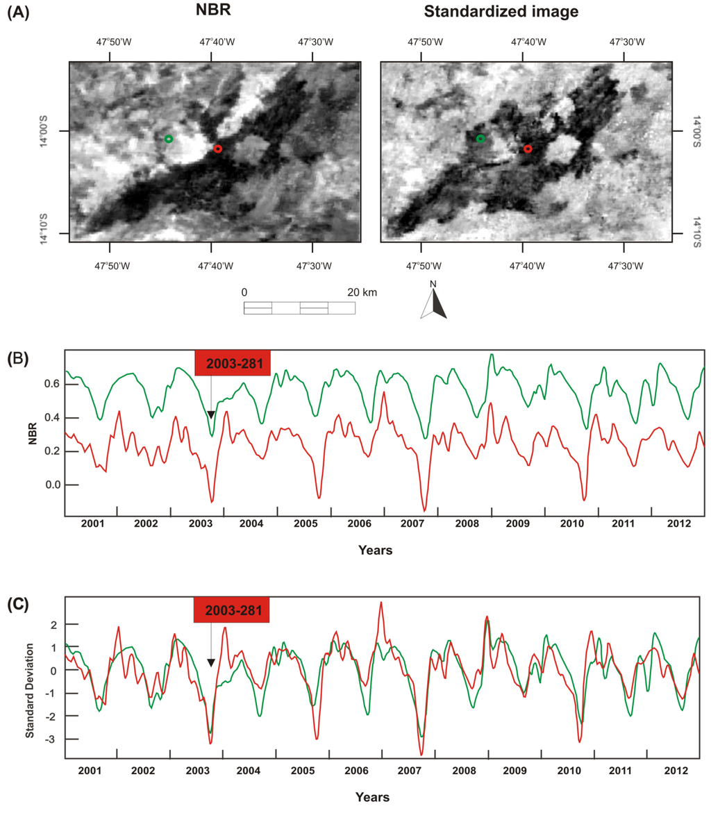 Comparison between the NBR and NBR standardized data: (A) NBR-MODIS composite image (Julian day 281–2003) and its respective standardized image, (B) NBR temporal curves for the savanna (red point) and Closed Savanna Woodland (green point), and (C) NBR standardized temporal curves for the same points.