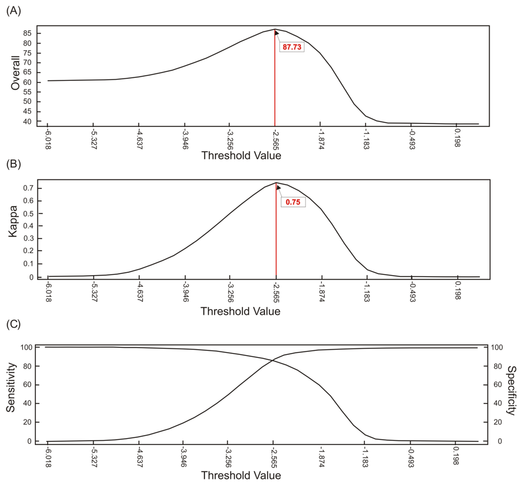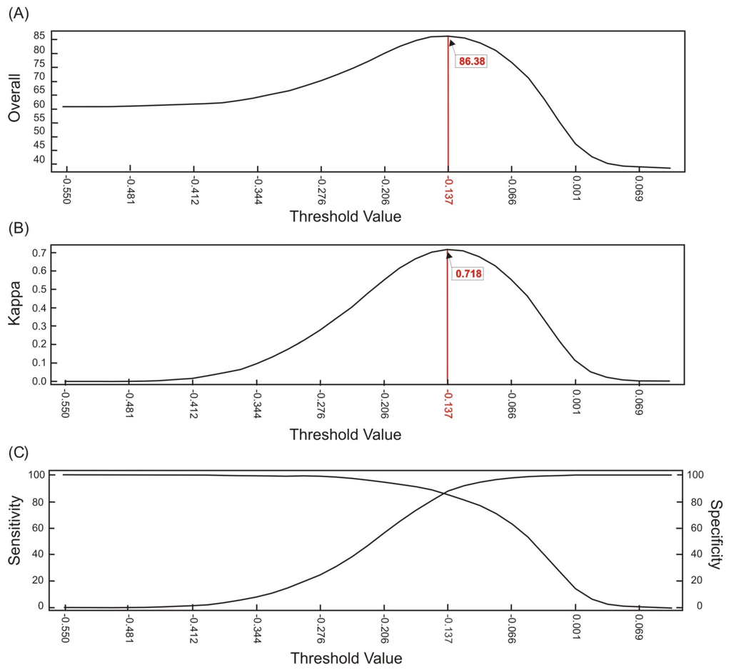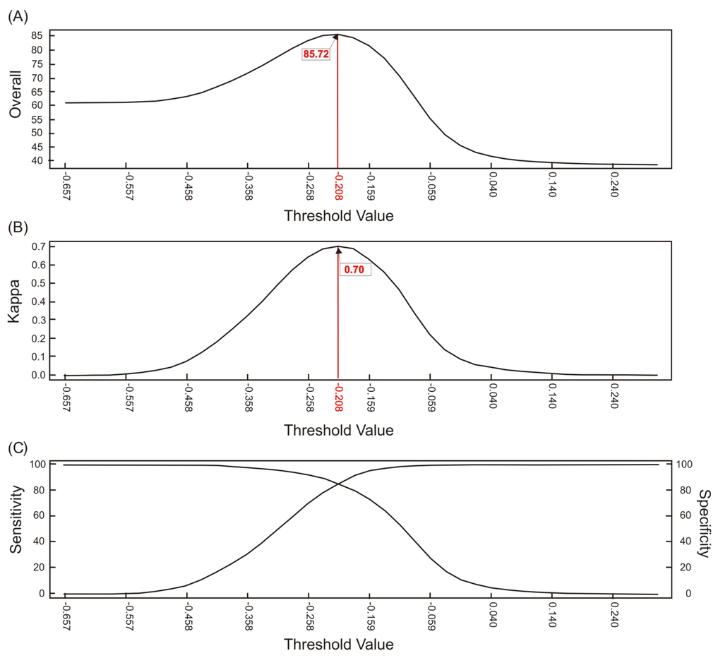 In addition, the sensitivity (true positive rate, expressed as a percentage) and specificity (true negative rate, expressed as a percentage) curves were calculated to evaluate the best threshold. The increased specificity implies a decreased sensitivity and back again. Each sensitivity/specificity pair corresponds to a particular decision threshold. Normally, the intersection of the two curves represents the threshold point near the highest Overall Accuracy and Kappa coefficient. Therefore, the closer the curve intersection is to the upper (100%), the higher the accuracy of the test.
