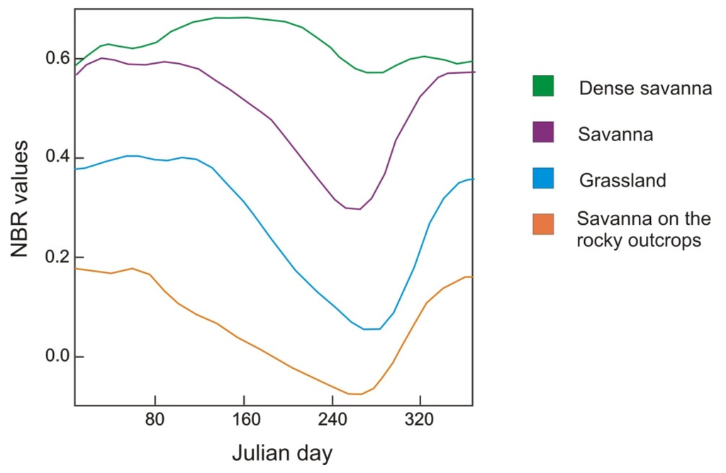 Figure 15 shows the mean phenological signatures for major vegetation types in the CVNP. Savanna on rocky outcrops has the lowest NBR values, probably due to interference and mixed spectral with the areas of outcropping rocks. NBR values increase gradually with the increment of arboreal covering open grassland to dense Cerrado. The phenological curve of the dense Cerrado presents the highest NBR values and a delay of leaf senescence compared to other vegetation. Carvalho et al. [83] observe that the dense Cerrado at the beginning of the dry season (June) has the following characteristics: chlorophyll a and b concentrations were higher, chlorophyll a/b ratio was lower, and total chlorophyll/carotenoids ratio is significantly greater to the higher chlorophyll concentration. This distinct behavior of the dense Cerrado is evidenced in temporal curves.