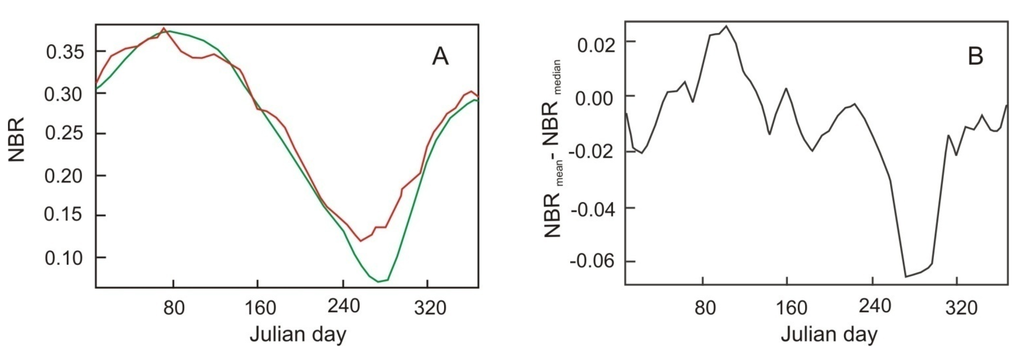 The NBR average annual corresponding to a 12-year period (2001–2012) evidenced the phenological behavior at each pixel of the image. The measures of central tendency (mean, median and trimmed mean) lead to a noise minimization and provide an appropriated baseline to be compared over time for each pixel. The key issue is to establish for each pixel a phenological curve to be employed in the burned-area detection, instead of the previous year used in the seasonal differencing.
