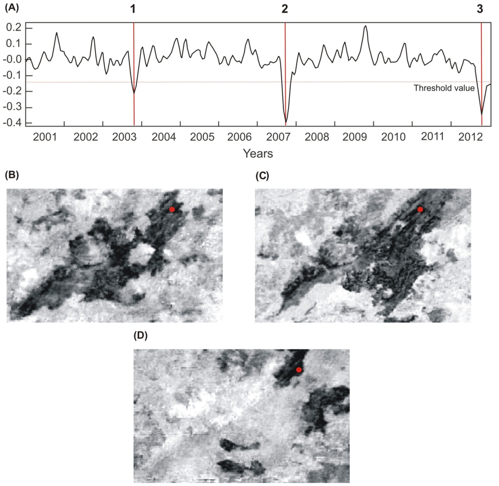 - Verbesselt, J.; Jonsson, P.; Lhermitte, S.; Jonckheere, I.; van Aardt, J.; Coppin, P. Relating time-series of meteorological and remote sensing indices to monitor vegetation moisture dynamics. In Signal and Image Processing for Remote Sensing, 2nd ed.; Chen, C.H., Ed.; CRC Press/Taylor & Francis Group: Boca Raton, FL, USA, 2008; pp. 153–173. [Google Scholar]