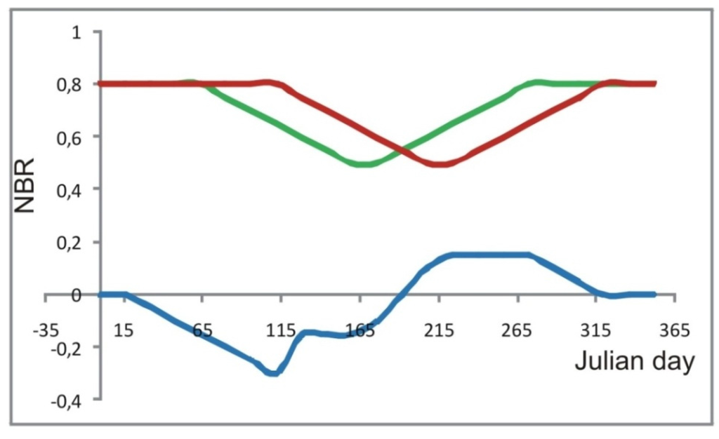 The mean curve calculation is the sum of the NBR values for a same eight-day period in the different years divided per year range (Figure 7). This measure is appropriate when the fire recurrence is very low. The fire recurrence provokes a decrease in the NBR mean values, impairing an adequate representation of the annual cycle of vegetation.