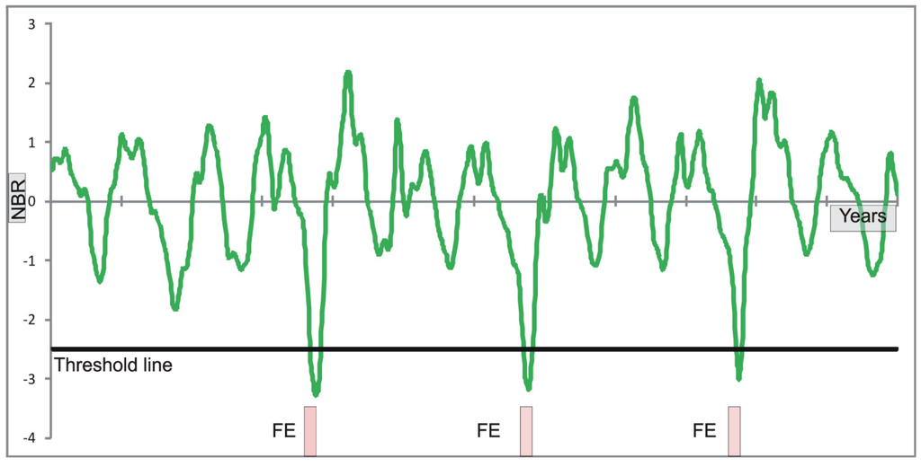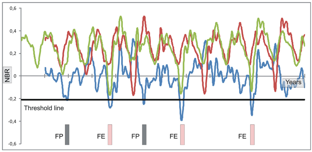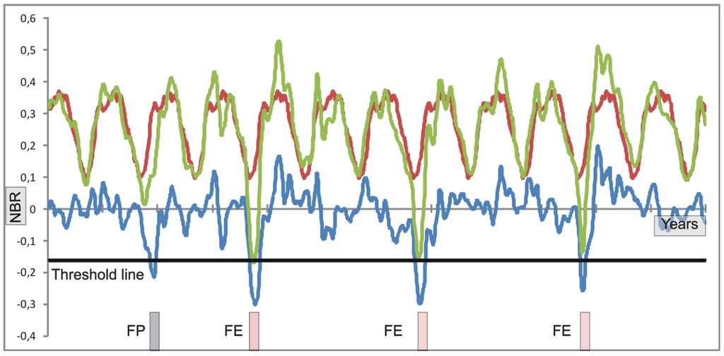 A reference curve of interannual phenological behavior for each pixel creates a baseline from which the time series are subtracted, minimizing the seasonal component and emphasizing the fire changes. The dNBRMODIS method performs a seasonal difference, in which the baseline is the previous year. Thus, the procedure is carried out by subtracting the value of each observation exactly one year earlier. However, this approach is susceptible to high signal-to-noise ratio [41]. If the previous year contains fire events, the seasonal-difference values are very high, though it does not represent a change event to the date concerned. Furthermore, the result of seasonal difference has one year less than the original time series.