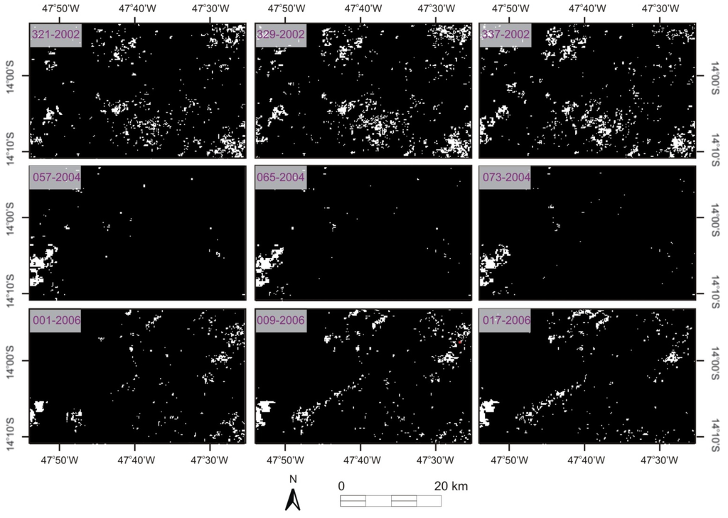 The optimal threshold value from accuracy analysis was applied to all time series (12 years) generating a mask series of burned areas (Figure 10). An inverse validation with independent data was used to quantify the goodness/advantages of the proposed methods. An additional reference map of burned areas from the Landsat TM image (22 September 2004) was compared with the burned-area masks of the respective day extracted from the MODIS image and the proposed methods.