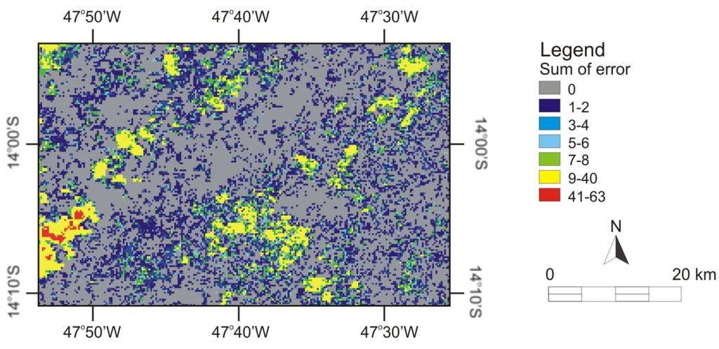 In the savanna ecosystem, the fire regime is a key component to the vegetation succession cycles, plant regeneration, maintaining biodiversity, and environmental management. Thus, the continuous mapping of wildfire activity provides fundamental spatio-temporal information about the ecosystem dynamics and vegetation patterns. Accurate information of natural and human influences about fire regimes are critical to prevent future events and restore areas already affected. Remote sensing is one of the main techniques for assessing the damage effects from fire events because of its synoptic nature, cost-efficiency, rapid wildfire damage assessments, and acquisition of long-term information about ecosystem dynamics [1,2,3]. Several remote sensing techniques have been proposed to assess burned areas [4,5]. The most commonly used technique to enhance the burned areas combine two procedures, which adopt simple algebra formulations: (a) spectral index from the sensitive bands to variations in char, ash, moisture and living and dead vegetation; and (b) temporal image differencing between pre- and post-fire images, as a technique for minimizing environmental variations and seasonal changes.