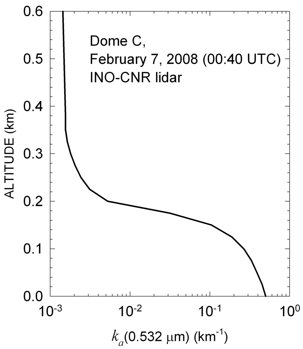 (4) A vertical profile of ka(z) for a diamond dust particle layer calculated from measurements of Bbs(0.532 μm) carried out at the French-Italian Dome Concordia base (~75°S) using the INO-CNR depolarization lidar, which is an automatic prototype operating at wavelength λ = 532 nm, equipped with a 10 cm refractive telescope, and having vertical resolution of 7.5 m, altitude measurement range from 30 to 8 × 103 m, and time resolution of 5 minutes. Regular INO-CNR lidar measurements were made during a strong event of diamond dust mobilization by surface winds observed on 7 February 2008 (from 00:30 to 01:20 UTC) and completed with the vertical profile of ka(z) derived from the Bbs(0.532 μm) lidar measurements carried out at altitudes z > 0.4 km.