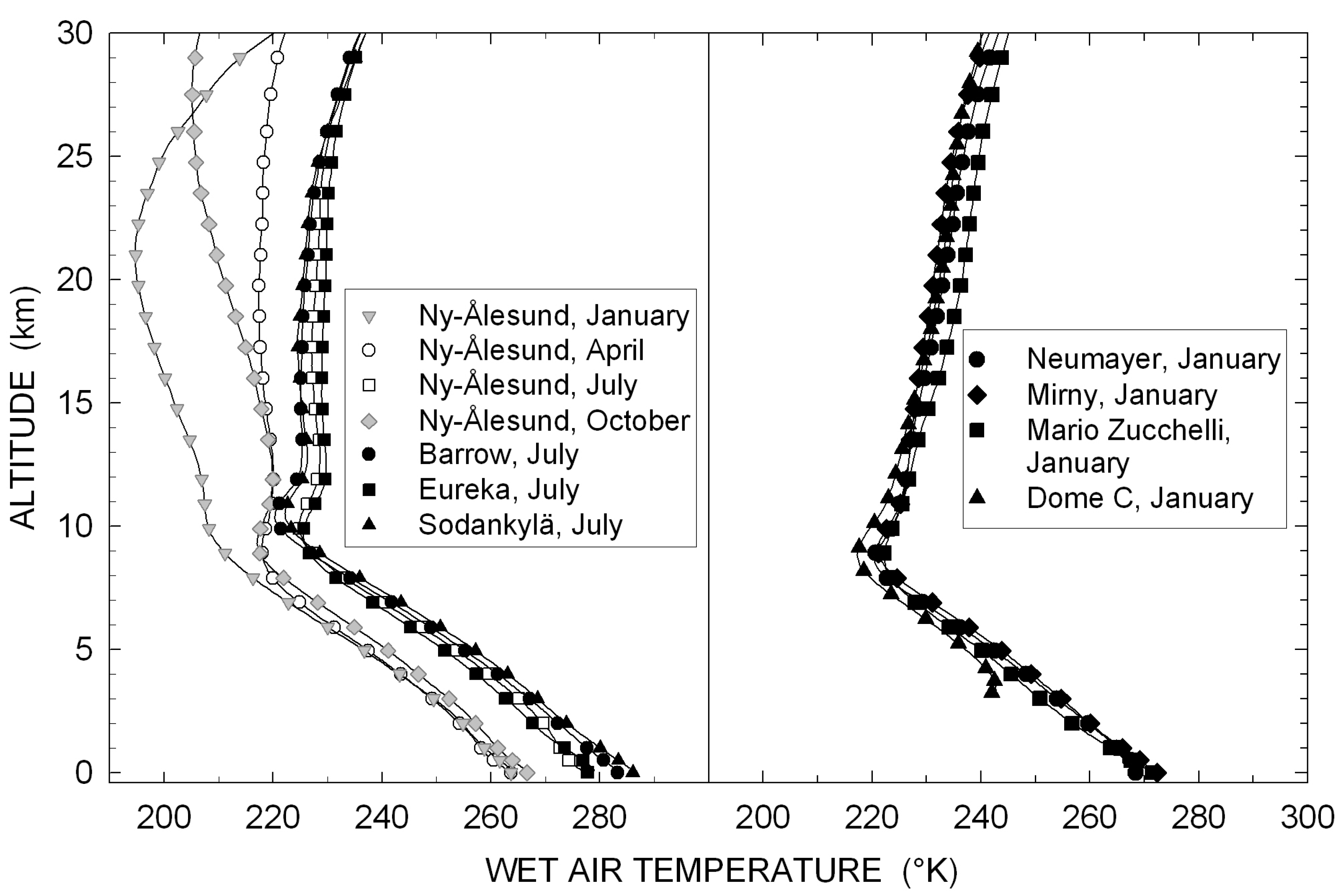 Monthly mean vertical profiles of wet air temperature T(z) derived over the 0 ≤ z ≤ 30 km altitude range from the multi-year radiosounding datasets collected at Ny-Ålesund in four different months and at three other Arctic sites in July (left-hand side), and at four Antarctic sites in January (right-hand side). Note that the vertical profile of T(z) (solid triangles) measured at Dome C on the Antarctic Plateau starts at the (surface-level) altitude of 3.233 km.