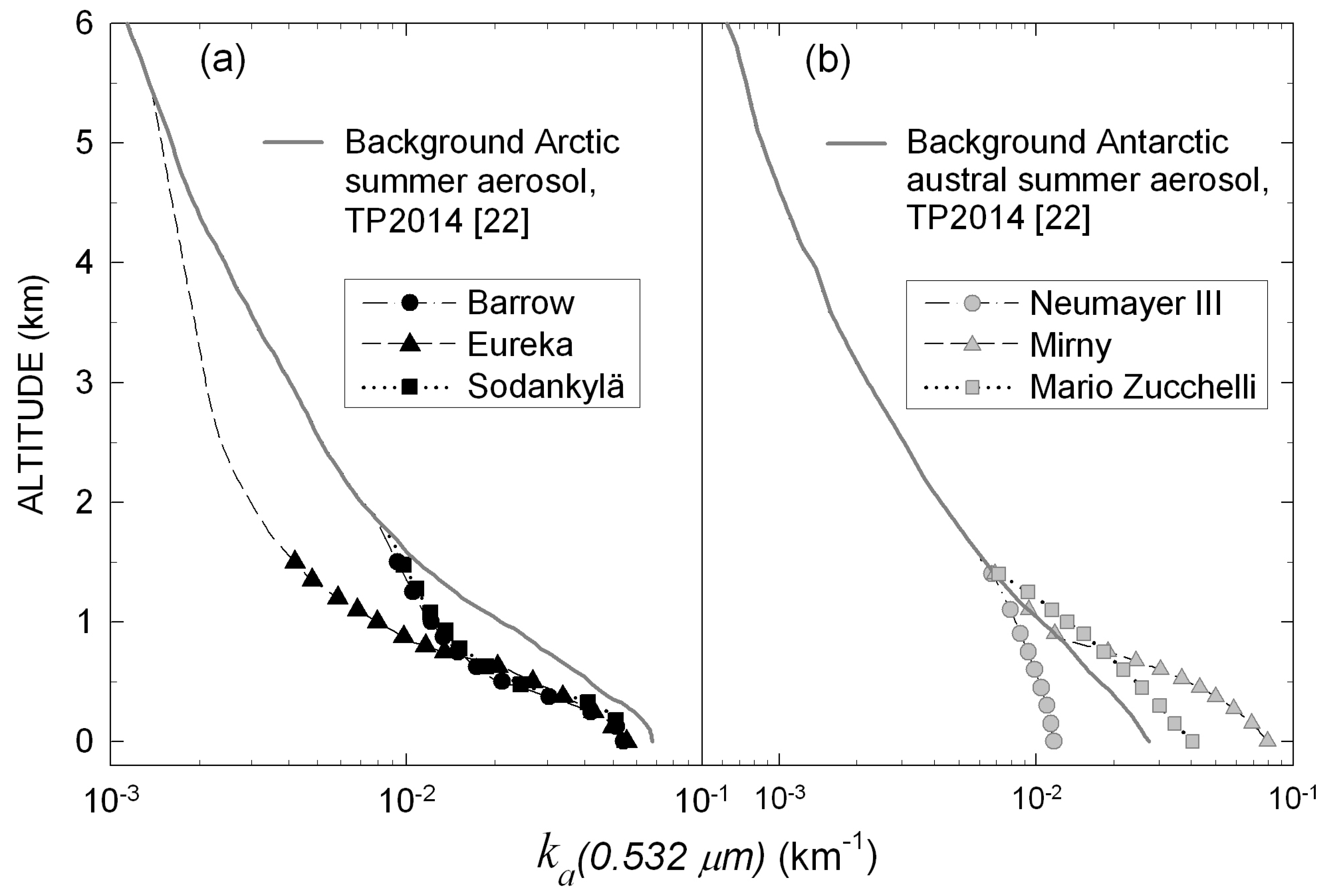 Vertical profiles of ka(z) were selected at various Arctic and Antarctic sites to represent the average extinction of background aerosols in the troposphere and low stratosphere during the local summer months. The background aerosol cases do not include volcanic particles in the lower stratosphere, nor Arctic haze, biomass burning smoke or Asian dust layers in the lower troposphere. More precisely, the following aerosol and cloud particle extinction profiles were considered in the present study: