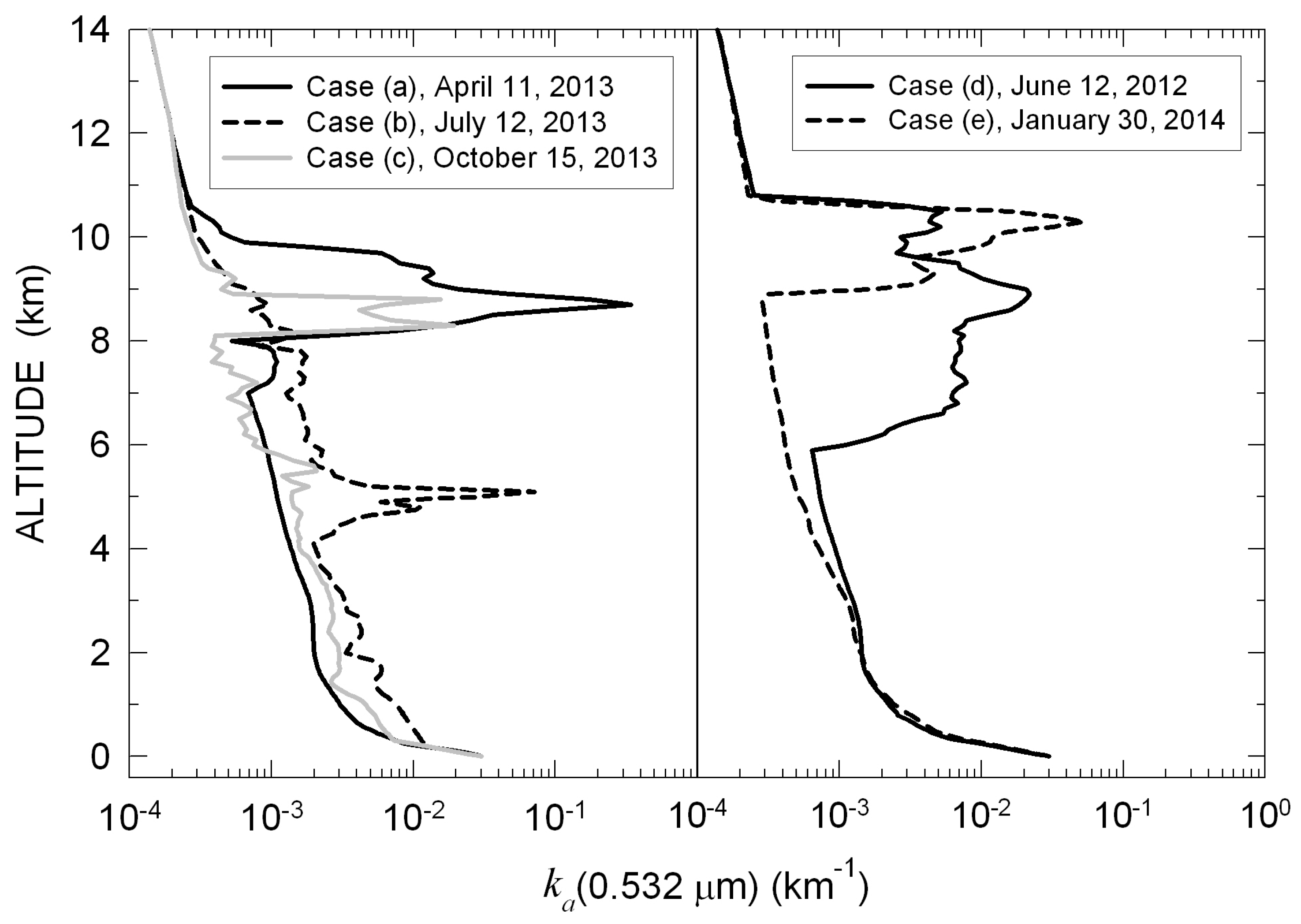 (5) Five vertical profiles of ka(z) determined from measurements of Bbs(0.532 μm) made in the presence of cirrus clouds at Ny-Ålesund, with the AWI KARL lidar-system on three days of April, July and October 2013, and at Thule (76°39'N, 68°46'W, 225 m a.m.s.l.) in northwestern Greenland using the University of Rome/ENEA lidar-system [35] on two distinct observation days in June 2012 and January 2014. The five cases are relative to clouds of different depths located at middle and high tropospheric levels.