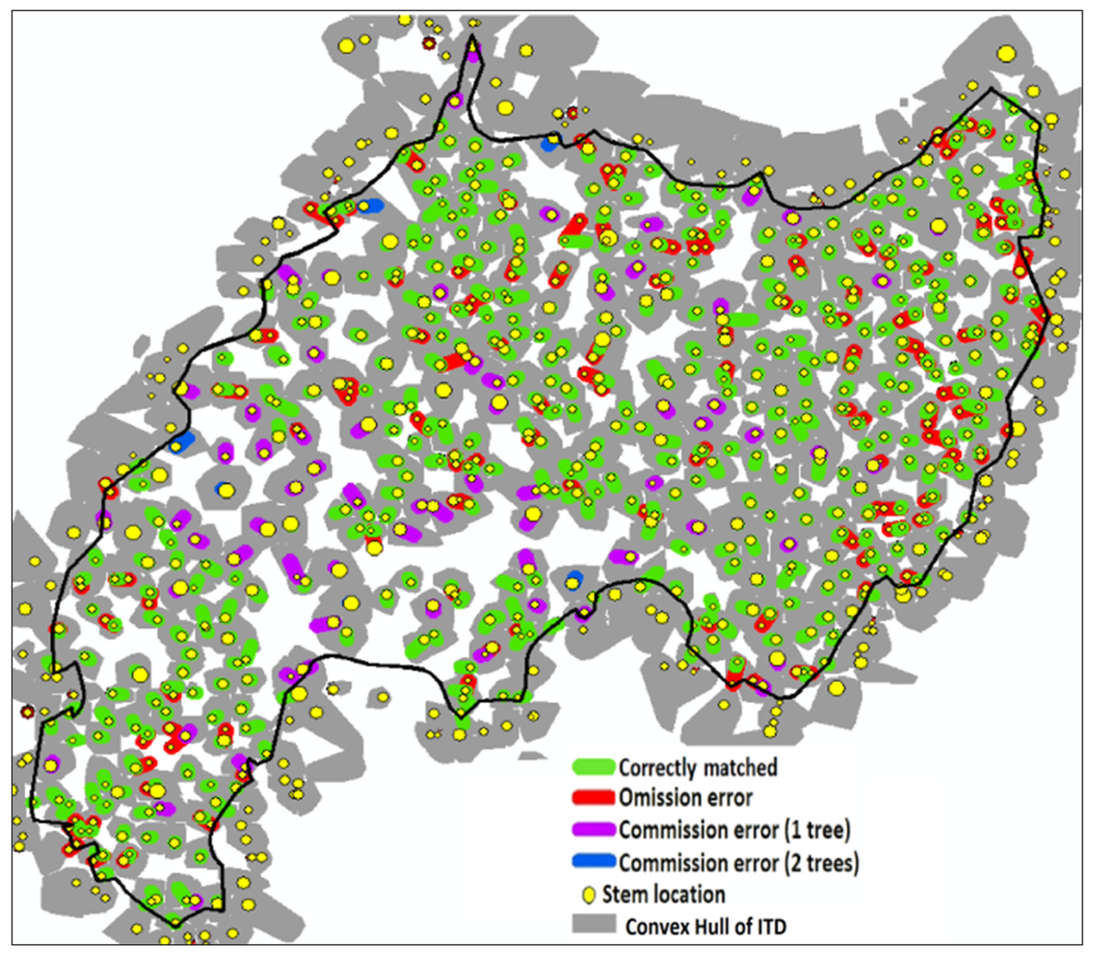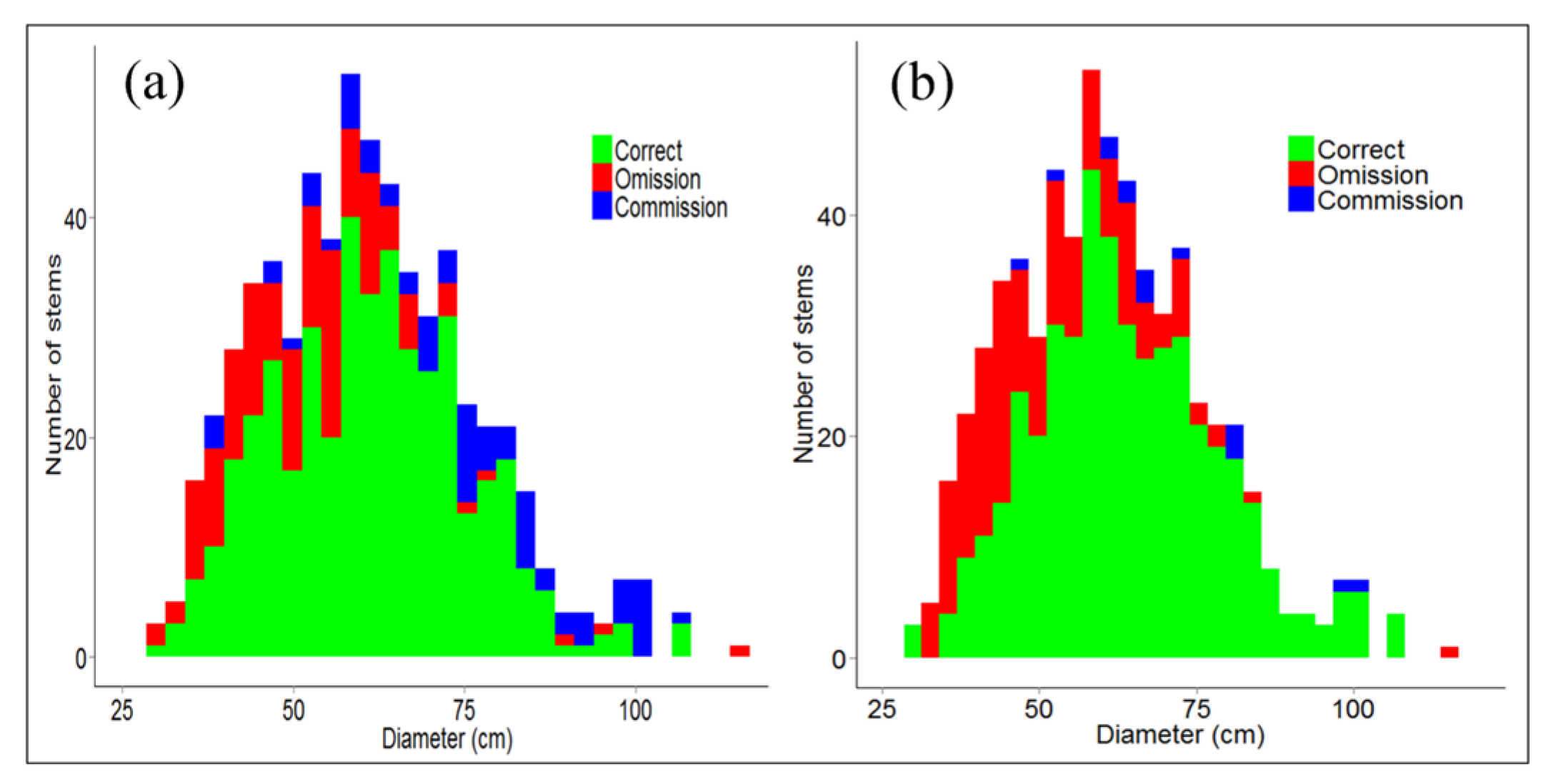 Figure 7 to show how well the heterogeneity in tree-crown form explains the distribution of stem commission and omission errors. Commission errors were more frequent in stands with large canopy gaps, as over-segmentation occurred for large tree canopies that extended towards large adjacent gaps.