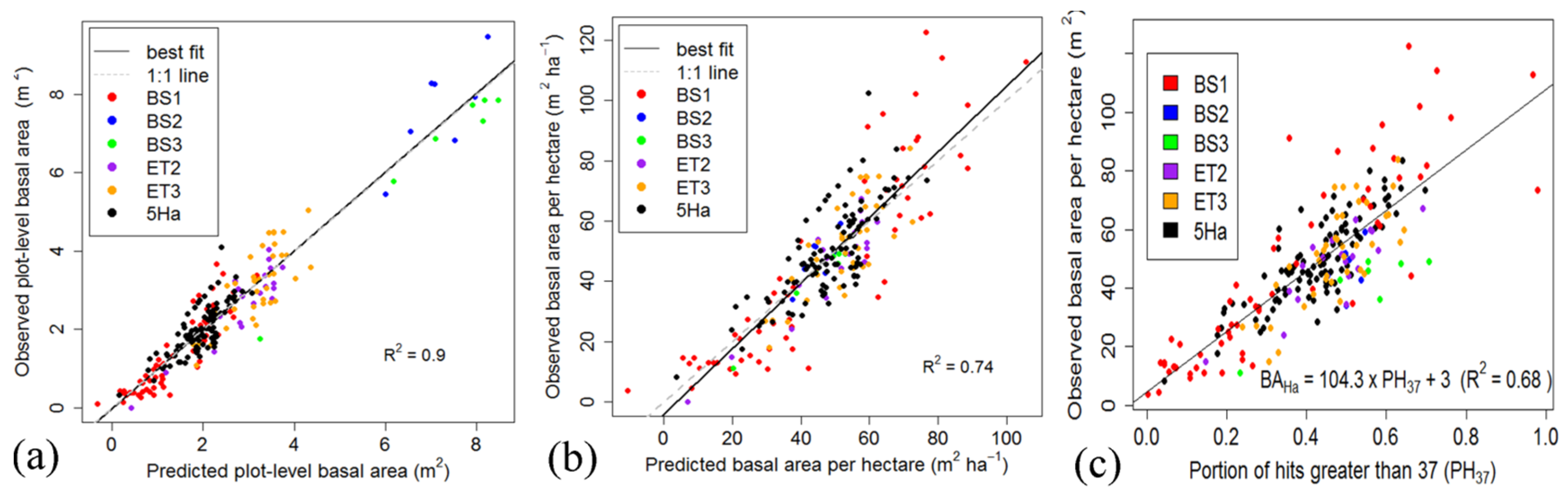 For estimating BAHa with plot resolution of the order of 0.04 ha, the NCut algorithm was a significant improvement over an area based method with mixture distribution functions, explaining 7% to 30% (median: 9%) more variation in BAHa for individual catchments. When applied to all catchments, we were able to produce a model that explained 68% of BAHa using only the PH37 index that applies the NCut ITD segments. We demonstrate that this model may be extrapolated for one ha resolution estimates without the need to compute ITD segments. The two-step procedure involves calculating BAHa estimates by averaging PH37 values calculated for each 20 m × 20 m grid cell over 100 m × 100 m grid cells.