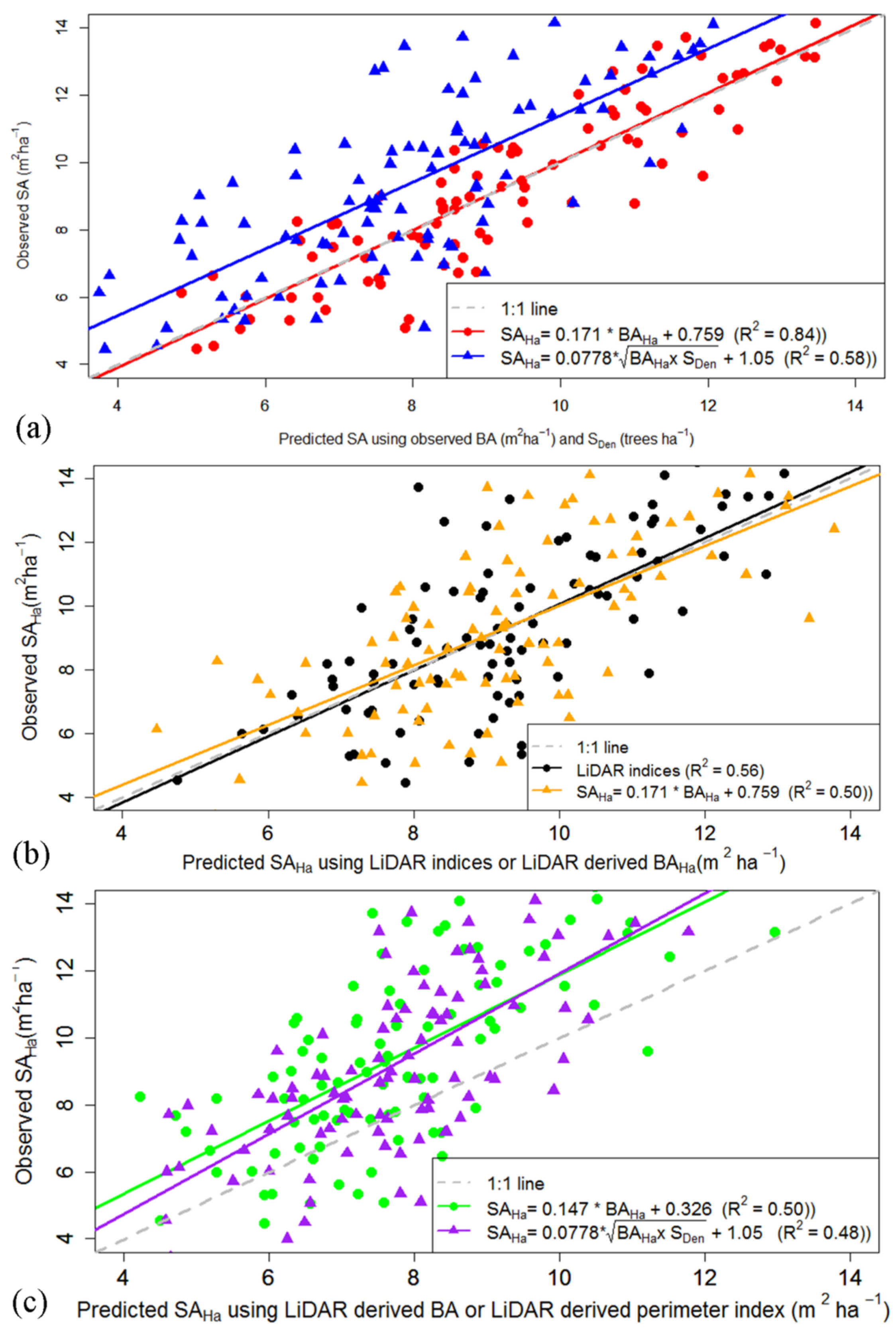 Is it more accurate to predict stand SAHa with: (i) a RHa relationship and BAHa estimates derived from LiDAR; (ii) a stand perimeter index that relies on accurate SDen and BAHa estimates; or (iii) LiDAR indices directly related to stand SAHa?