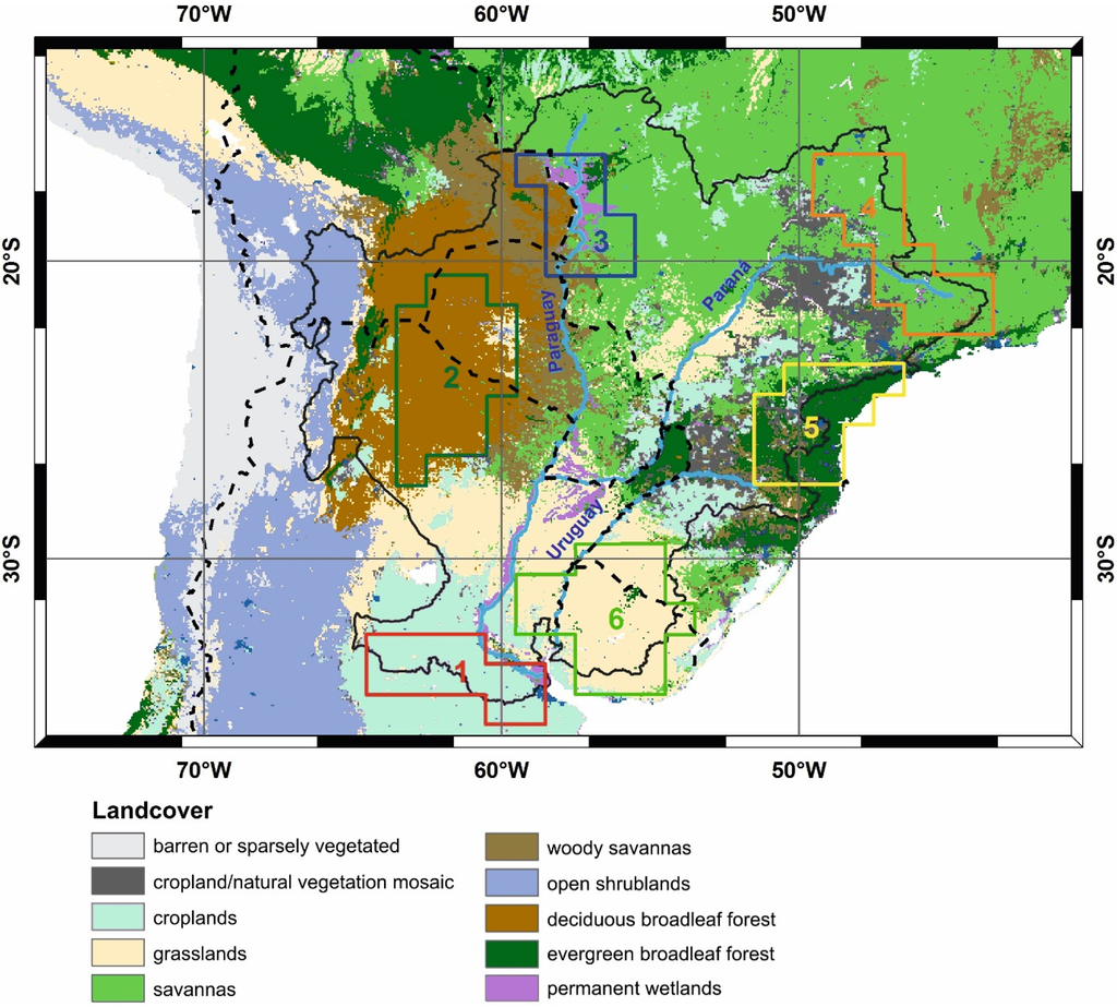 - Western deciduous broadleaf forest (Chaco; Figure 1, sub-region 2): The Chaco is a subtropical area and located west of the Paraguay River and east of the Andes [35]. It is the warmest region in the La Plata Basin. In summer, the daily maximum temperature often exceeds 45°. The rainy season usually takes place between September and April. The semi-arid plains of the Chaco are dominated by dry woodland, which (approaching to the east) transform into more open savannas (Figure 1).