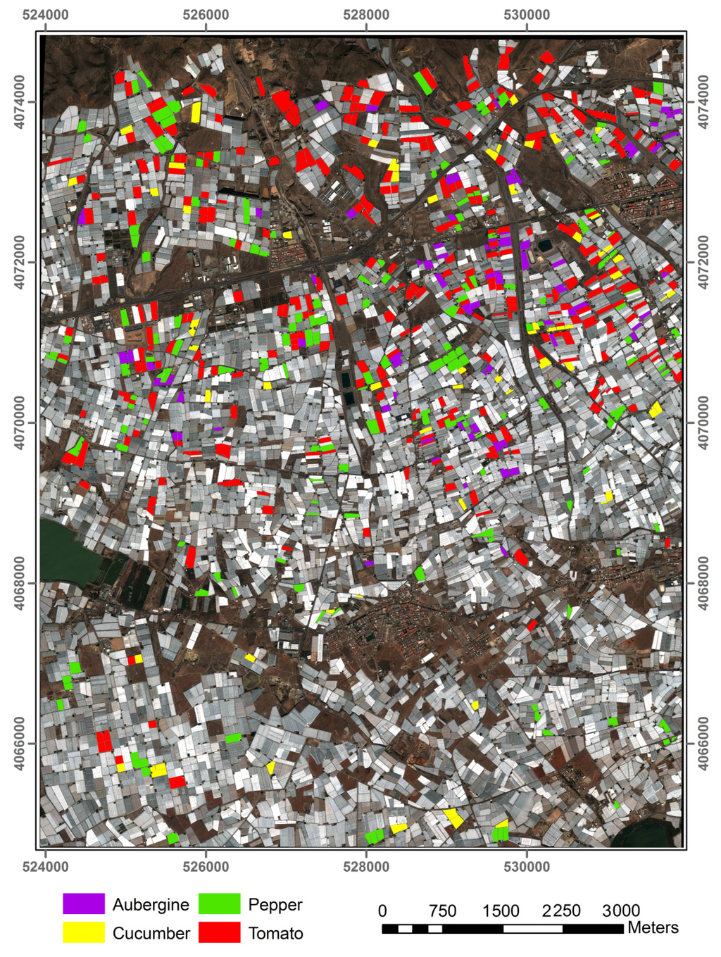 The practice of using plastic materials to advance the first harvest and increase the yield of horticultural crops has been steadily increasing during the past 60 years in the entire world [1]. Perhaps nowhere this process is more visible than around Almería, southern Spain, where agriculture under plastic has become a key economic driver. However, this productive sector is being affected by an unstable and changing geopolitical situation of the markets. In this regard, facts, such as the entry into force of the new agricultural agreement between the European Union (EU) and The Kingdom of Morocco adopted in 2012, which liberalizes EU-Morocco trade in agriculture (Council Decision of 8 March 2012, 2012/497/EU), or, more recently, the Russian veto of horticultural products from the EU, are causing important changes in the market prices of products grown under plastic-covered greenhouses, which significantly affect farmers and agribusiness. In order to alleviate these changes in market prices, each agricultural cooperative in Almería is carrying out a crop acreage plan to be applied by their farmers. However, a more globalized planning of horticultural production would be desirable. Certainly, the possibility of knowing the crops that are being grown under greenhouses along an agricultural campaign, both focused on our local productive sector and our direct competitors, would help decision making in order to keep prices up, thus maximizing returns to farmers. In that sense, useful information for decision makers would include cropland extent, crop types, crop rotation dynamics, and so forth [2]. This sort of information over space and time can be repeatedly, consistently and accurately acquired by methods relying on remote sensing without exception [3]. In fact, remote sensing can significantly contribute to providing a timely and accurate picture of the agricultural sector, as it is very suitable for gathering information over large areas with high revisit frequency [4].