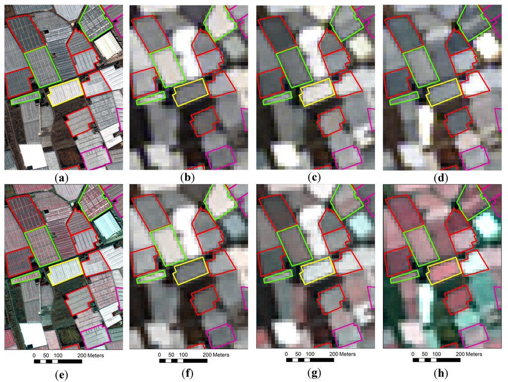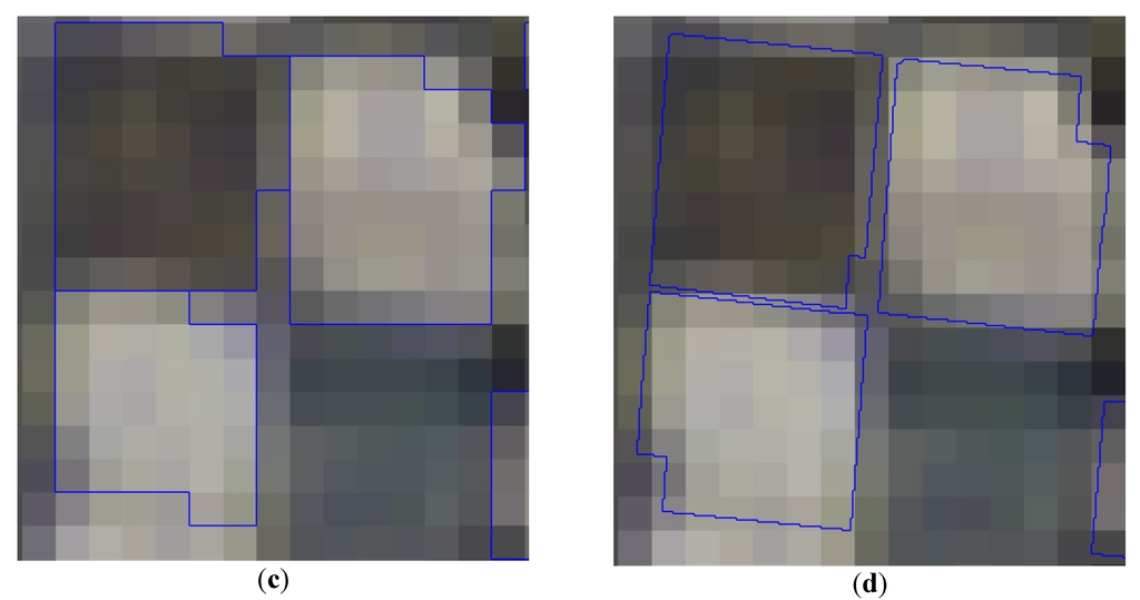The OBIA software eCognition v. 8.8 was employed for the extraction of the object-based features from both Landsat 8 and WV2 orthoimages shown in Table 3 and Table 4 [37,38,39,40,41,42,43,44,45,46]. To this end, the chessboard segmentation algorithm included in eCognition was applied on a thematic layer composed of a previously digitized vector file with the 694 reference greenhouses. Using this approach, the software only projects the vector file on the images in order to obtain a boundary adapted to the pixels that compose them (Figure 3). One eCognition project was conducted for the eight multi-temporal Landsat 8 pan-sharpened orthoimages by halving four times the original 15-m GSD on the created project tab in order to increase the geometric resolution to 0.9375 m per pixel. Thus, the segmentation fit better to the reference greenhouses (see Figure 3a,c,d). In the case of the single WV2 MS orthoimage, another project was performed within eCognition, where the original GSD (1.6 m) was enhanced up to 0.8 m per pixel (Figure 3b). The main goal was always to attain the best possible segmentation for our 694 reference greenhouses.