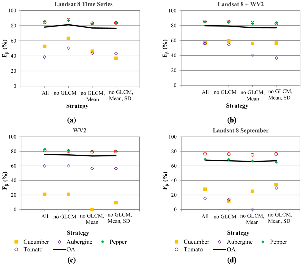 This section is devoted to detecting the optimal temporal windows for gathering the satellite imagery time series, as well as crucial time periods for under-greenhouse crop identification. The first step was to assess the classification accuracy attained from each of the nine available single orthoimages, always using the no GLCM strategy. Table 6 shows that the best classification results were obtained from the WV2 orthoimage, likely due to its much higher spatial resolution. With regard to the eight Landsat 8 orthoimages, the best OA values were assessed from the images taken in August (73.2%), on 26 July (69.7%) and in September (67%). The OA values for the rest of the images ranged from 65.4% to 63.2%. According to the agricultural practices of the working area, the importance of the images taken in August and late July could lie in the application of white paint. Along September, some crops reach a significant size, and therefore, leaf pigments (chlorophyll, carotenoids and anthocyanins) begin to influence the signal captured by the satellites (e.g., NIR band), although in this month, there are still numerous greenhouse coverings painted white (Figure 5g). In November, most of the greenhouses have been washed, so being transparent to the electromagnetic radiation reflected from the crops inside (Figure 5h). However the OA value computed from this single period was quite poor.