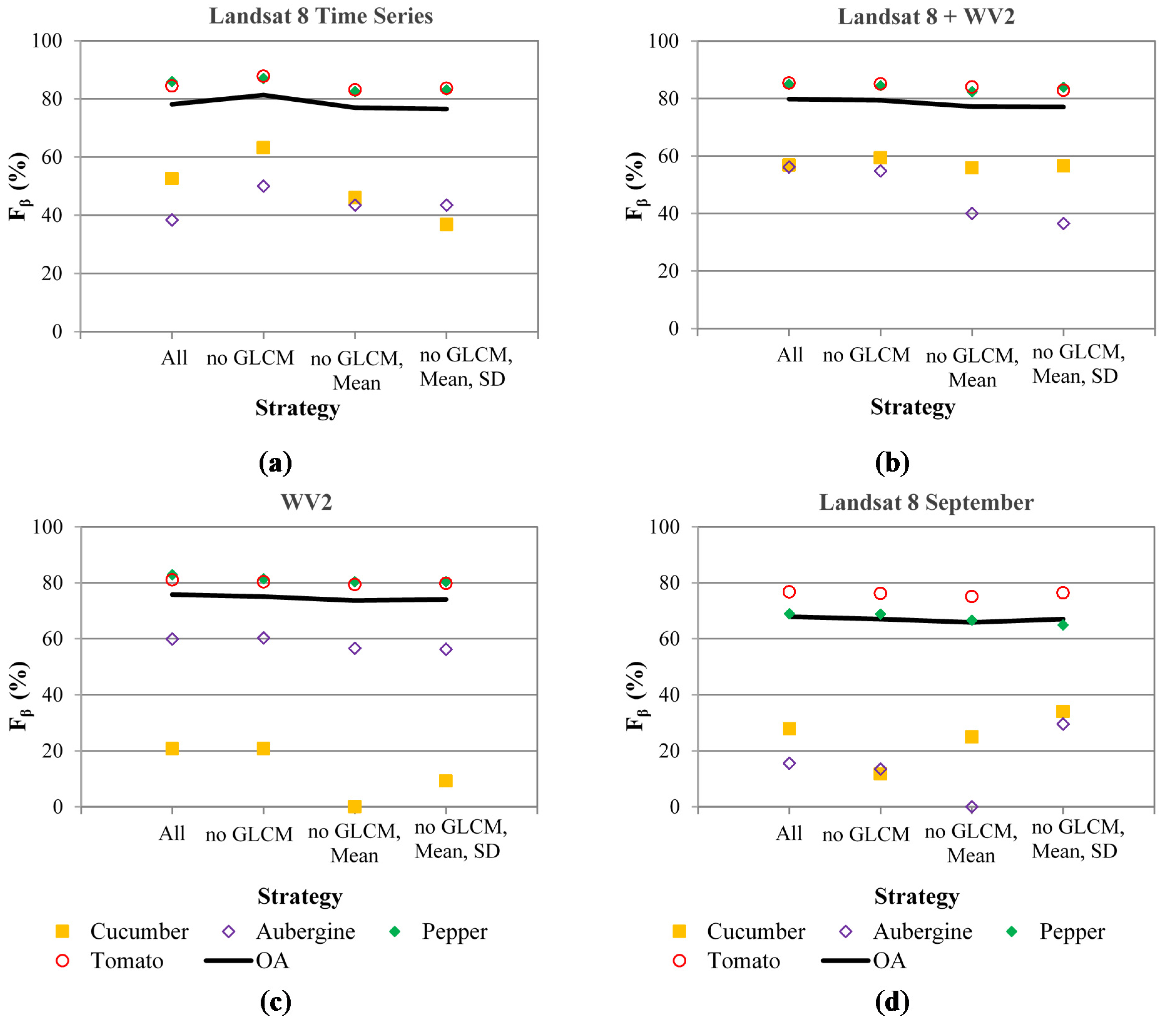 Figure 4b). OA values were far worse when only a single growing season period was considered, highlighting the suitability of multi-temporal images taken along the growing season to improve under greenhouse crop discrimination. In this way, and applying the no GLCM strategy, OA values of 75.1% and 67% were achieved for WV2 and Landsat 8 September datasets, respectively (
