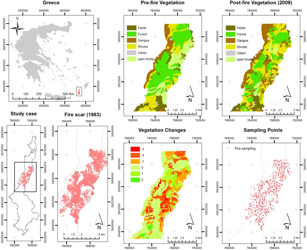 Post-fire vegetation recovery on the island of Karpathos results from a combination of factors such as pre-fire vegetation, fire history, environmental conditions (climate and landscape structure), and human-induced changes in time and space. It can be argued that when the identified significant variables are interpreted within a combined framework, the effects of site quality, resource availability, and human influence are apparent. This is in general accordance with other studies examining ecosystem resilience [58] or long-term post-fire regeneration [17]. Our combined approach based on remote sensing techniques [31] and geographic information systems does not require large capital investment. Through simple techniques, sites that require special focus and extra effort regarding ecosystems recovery can be identified. Specific management actions to support regeneration or to monitor recovery can be focused on parts of extensively burnt areas that exhibit the lowest recovery potential in terms of physical environment. Our results also indirectly demonstrate some methods that can be applicable in post-fire management. The enhanced recovery at low inclinations leads to the consideration of techniques that reduce slope’s inclination, as for example the use of logs to build barriers. Such information is important to restoration ecologists and stakeholders, as they can distribute capital and effort explicitly to parts that require human interference.