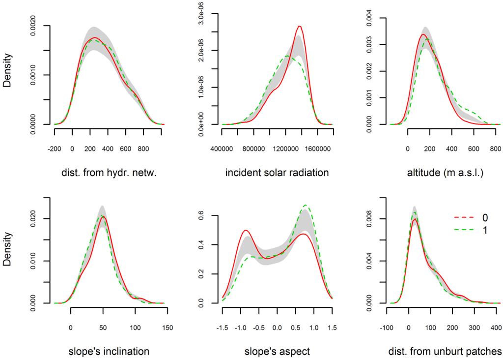 As a proxy variable that indicates ecosystem recovery, we used the difference between the NDVI and NBR indices just after (1984—the year after the fire where the burned area signal is still evident in the satellite image) and in 2012. It is assumed that the greater the difference in indices values between these periods, the stronger the indication that a high regeneration rate, or recovery, has been achieved. The distributions of NDVI and NBR indices of burnt and unburned patches were plotted and linear regression analysis was performed between the values of the indices differences and selected environmental variables.