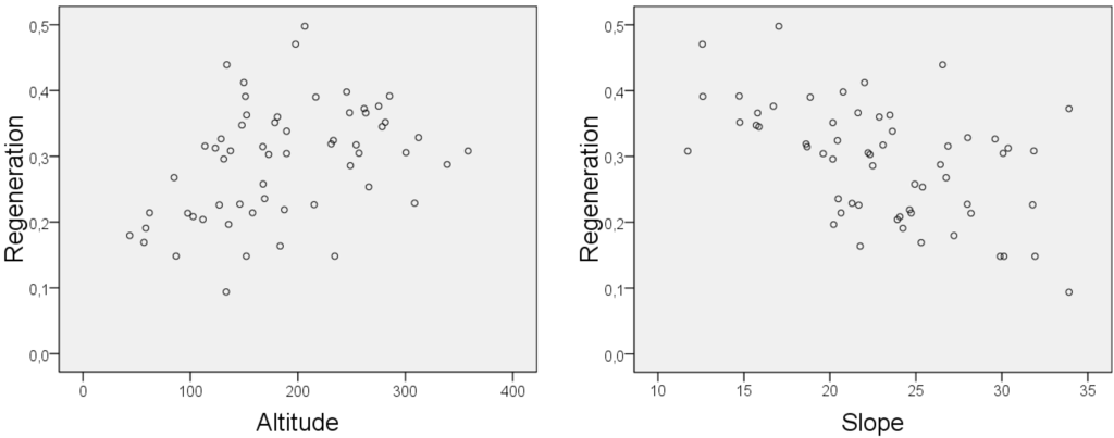 Very similar results were also obtained from the linear regression analysis. Altitude and slope inclination were identified as the dominant and significant variables affecting the magnitude of difference of the vegetation indices values (thus recovery) of the selected patches (Table 5). Recovery (estimated as large NDVI and NBR differences) is positively related to altitude, whereas “slope” shows a negative relation to recovery (Figure 7).
