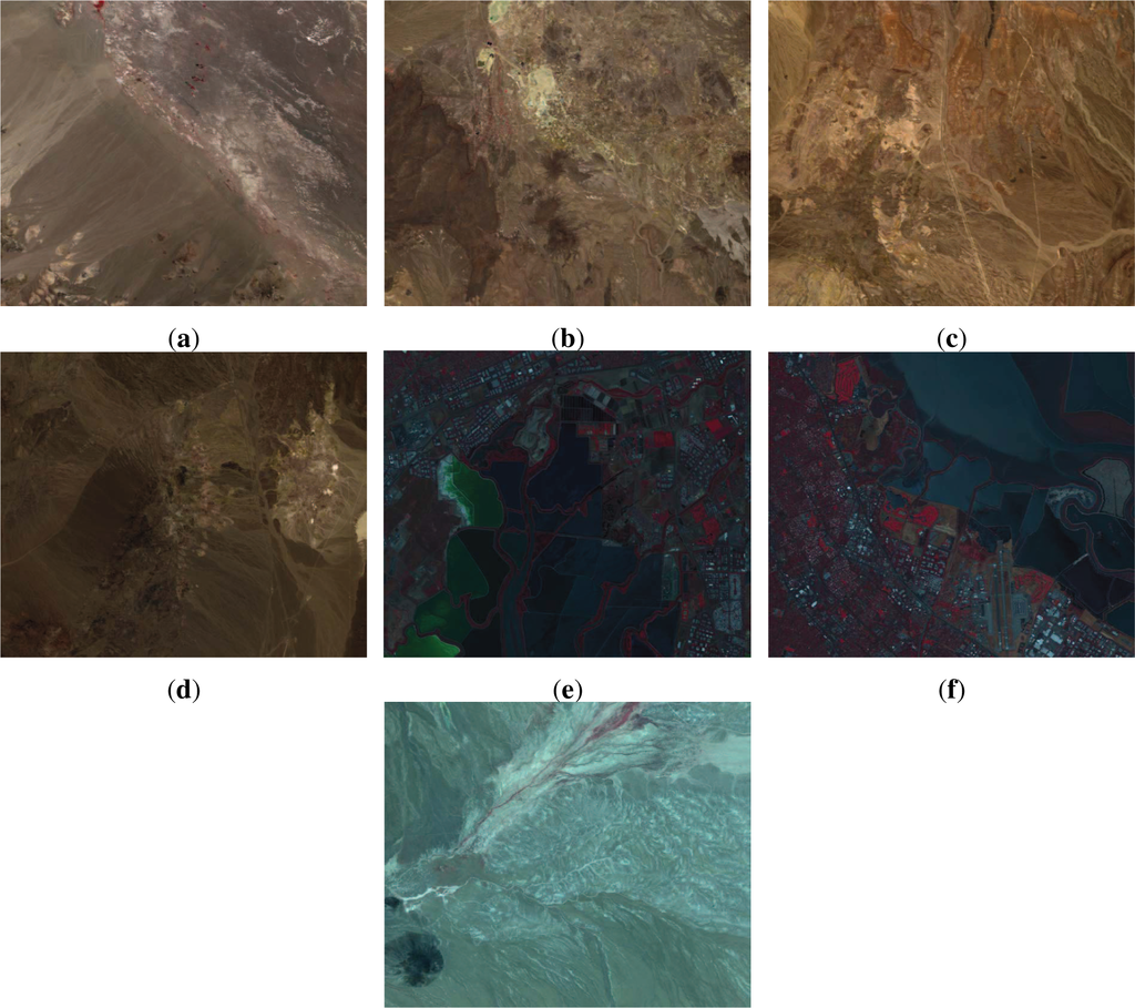 Figure 1. False-color composites of experimental hyperspectral images: (a) Lun.lake01; (b) Cuprite02; (c) Cuprite03; (d) Cuprite04; (e) Moffet02_igm; (f) Moffet03_igm; and (g) Lun.lake_igm.