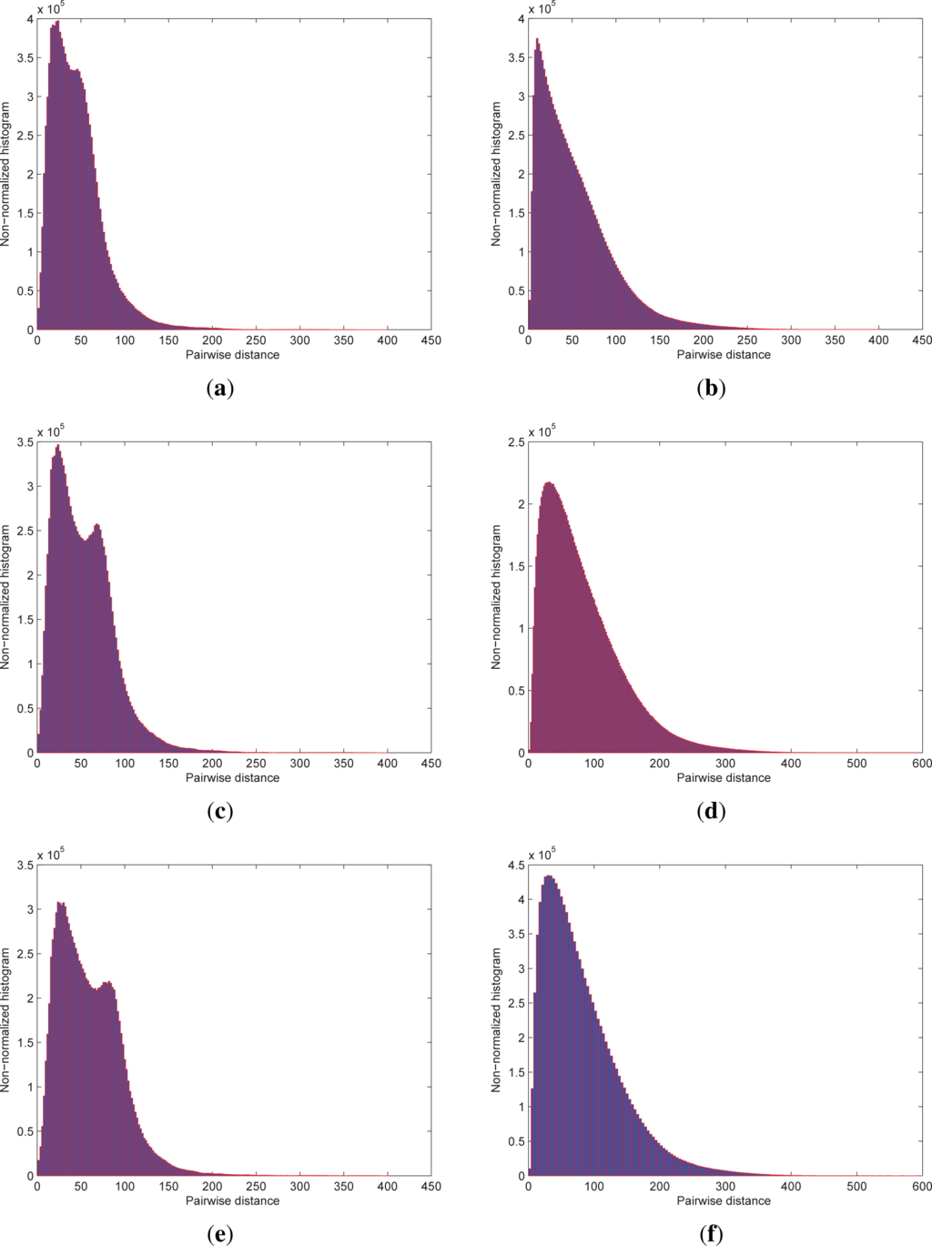 Figure 2. Non-normalized histograms of pairwise distances: (a) Moffet02_igm with 1 ∼ 60 bands; (b) Cuprite02 with 1 ∼ 60 bands; (c) Moffet02_igm with 1 ∼ 100 bands; (d) Cuprite02 with 1 ∼ 100 bands; (e) Moffet02_igm with all available bands (1 ∼ 206); and (f) Cuprite02 with all available bands (1 ∼ 197).