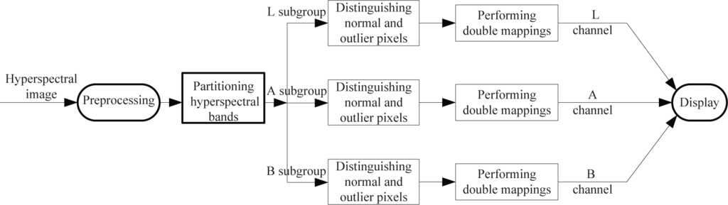 In this section, a new visualization technique for hyperspectral imagery is proposed, i.e., the pairwise-distances-analysis-driven visualization strategy (PDADVS). In this approach, normal pixels and outliers are treated separately using two different mapping methods for enhancing global contrast while avoiding the high risk of sacrificing local details and excessively distorting pairwise distances. For clarity, the flowchart of PDADVS is shown in Figure 5 and detailed descriptions of each step are provided in Sections 3.2 through 3.5.