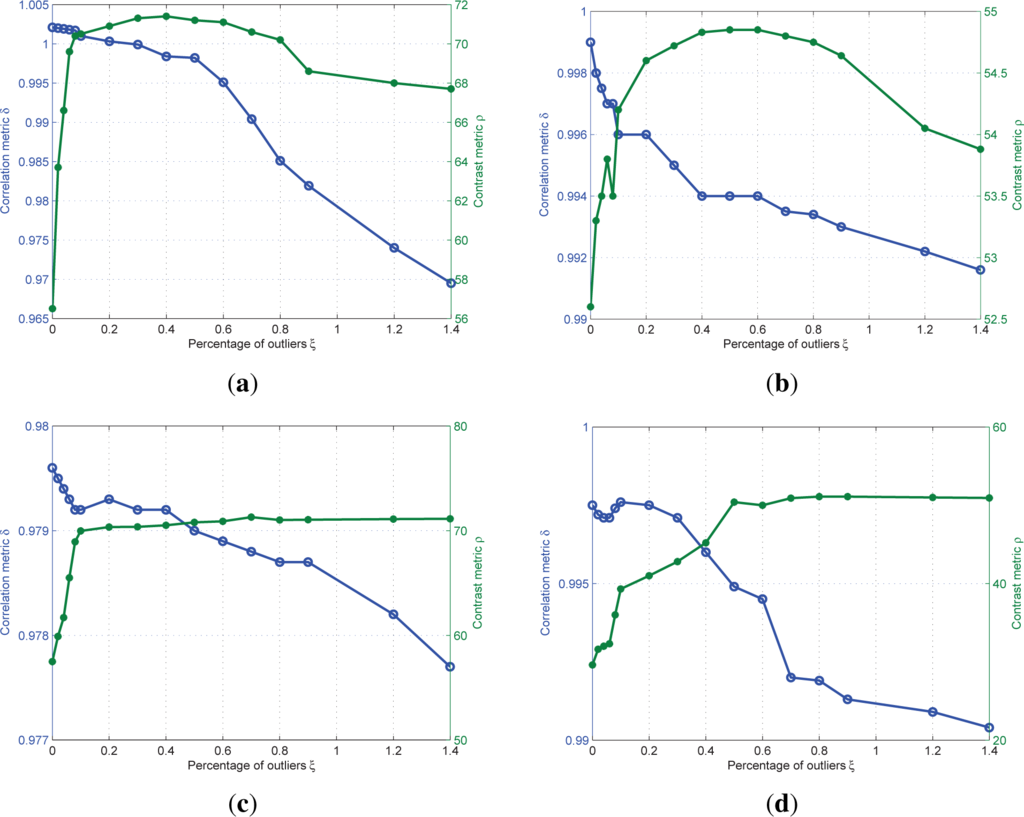 Figure 6. Correlation metric ρ and contrast metric δ for different percentages of outliers in pixels for our proposed PDADVS algorithm: (a) Cuprite02; (b) Cuprite04; (c) Moffett03_igm; and (d) Lun.lake_igm.