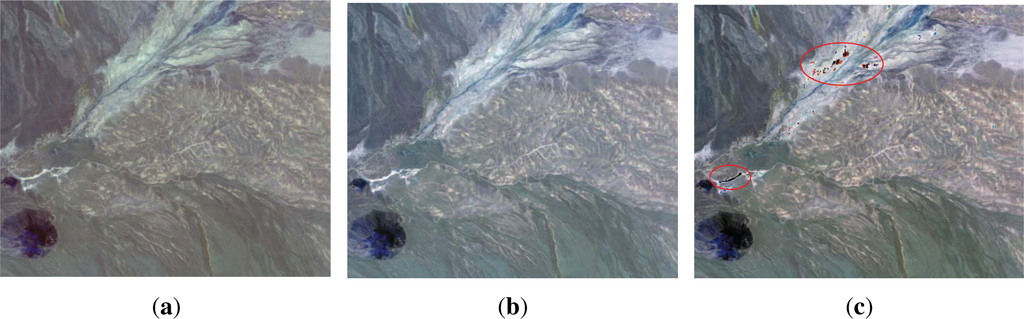 Figure 7. Comparison of color display results obtained by our PDADVS model with: (a) ξ = 0; (b) ξ = 0.5; and (c) ξ = 5 on the subimage (3161 : 3672, 21 : 634) extracted from the AVIRIS image Lun.lake_igm. The “pop out” areas are denoted by red ellipsoids in the Figure 7c.