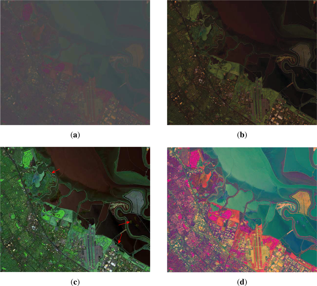 Figure 9. Visualization results for Moffett02_igm with range of (511 : 1022, 1 : 614) obtained by: (a) PCA; (b) BCOCDM; (c) PDADVS; and (d) PCA%2 [4].