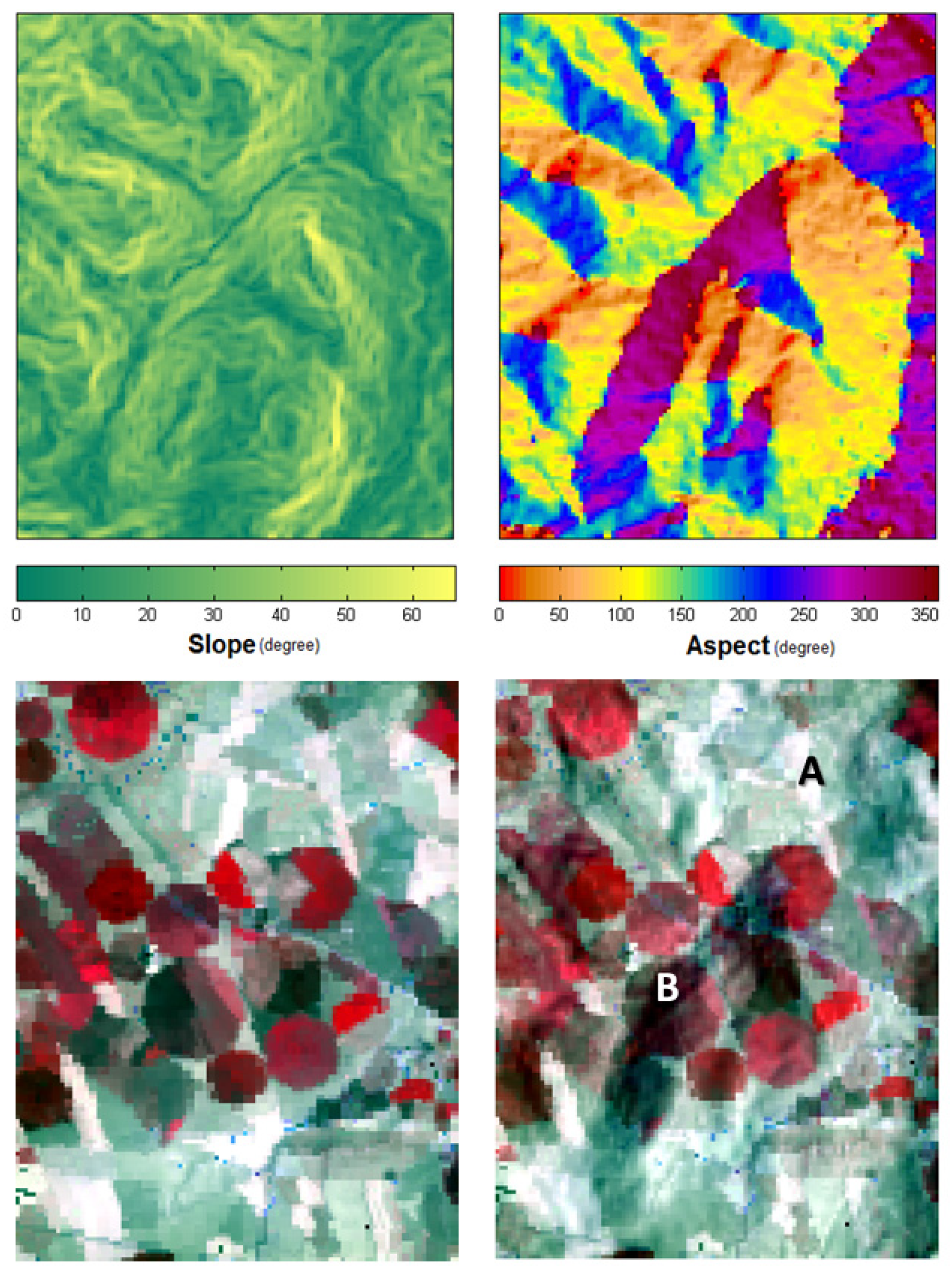 38. Proy, C.; Tanré, D.; Deschamps, P.Y. Evaluation of topographic effects in remotely sensed data. Remote Sens. Environ. 1989, 30, 21–32. [Google Scholar] [CrossRef]