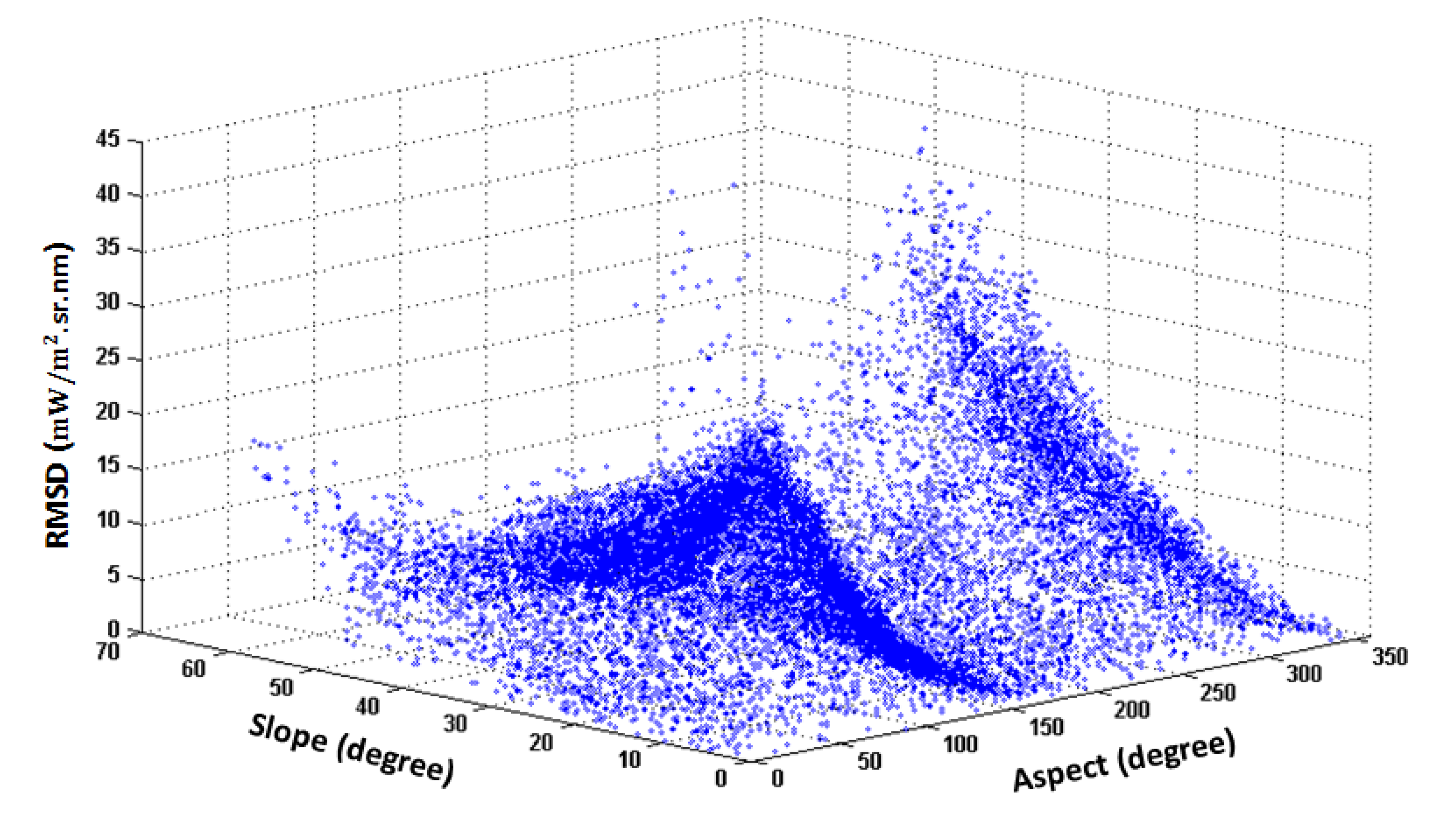 Figure 9 (left) illustrates the RMSD of all the CHRIS-Proba bands between the simulated radiance with and without applying sky view factor. RMSD values range from zero to 5 (mW/m2·sr·nm), though the increasing discrepancy is attributed to the steep and north-facing slopes. This quantifies the effect of sky view factor on the output radiance and shows that neglecting this factor can cause considerable uncertainty in forward TOA radiance modeling in particular for steep slopes.