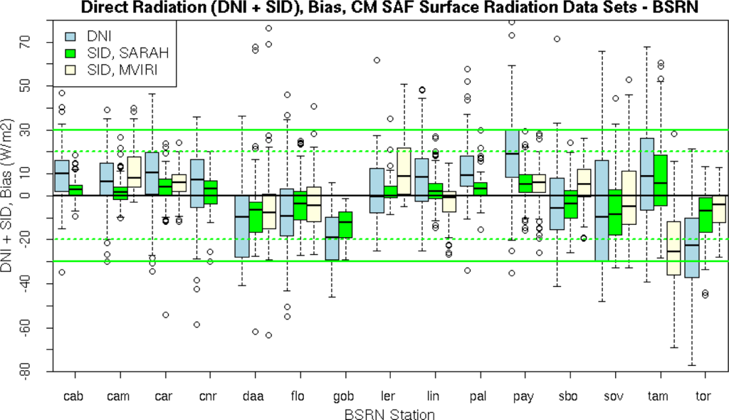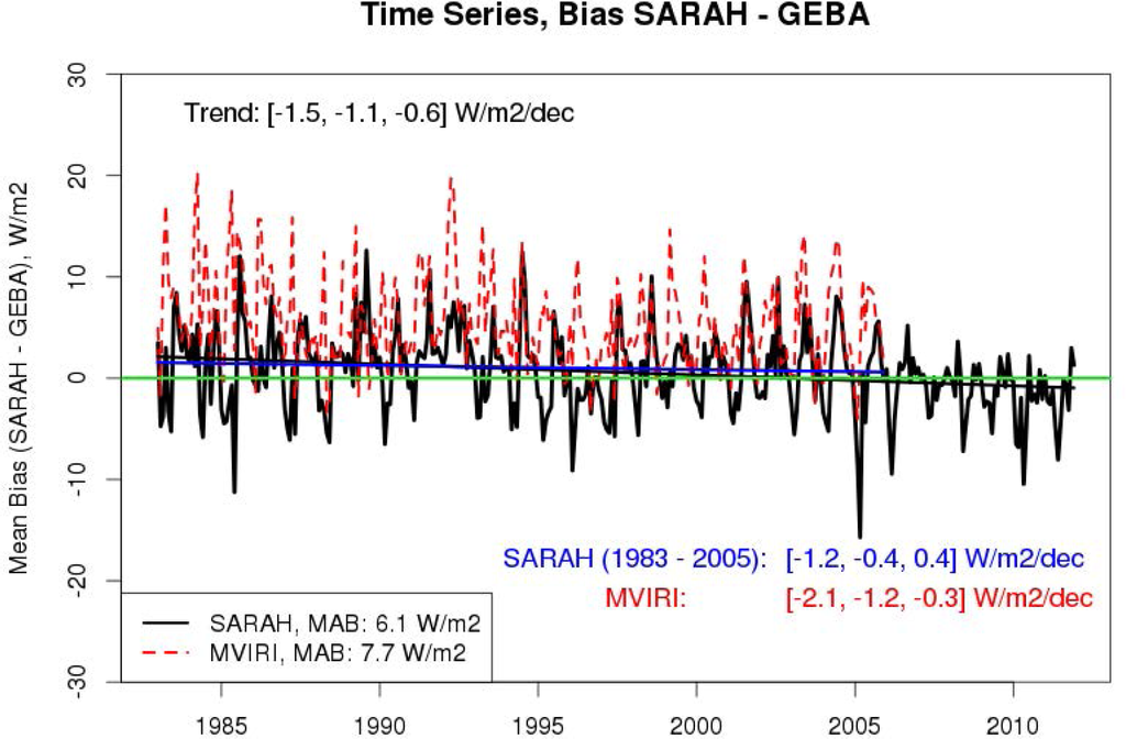 One of the first climate data records of solar surface radiation (SIS) has been provided by the International Satellite Cloud Climatology project (ISCCP FD, [] and citations within) and by the Global Energy and Water Cycle Experiment ([GEWEX SRB, []). However, these data sets lack in homogeneity [,] and are therefore only of limited value for the analysis of climate trends. Further, it has been shown that the accuracy is lower than that of the CM-SAF MVIRI data set, which has been therefore used as a benchmark for SARAH in this study. The more recent CERES data set [] comes in 1 degree resolution and starts 2000/2002. The time period covered by this data sets limits the ability of the monitoring and analysis of climatological trends and extremes. Additionally these data sets, except of the MVIRI CM-SAF data, have a relative coarse spatial resolution of 1 degree and coarser. As consequence these datasets are not well suited for regional applications, a strength of the new SARAH dataset presented in this article. A further climate data set is the HelioClim HC1 data set. It is estimated from Meteosat images with the Heliosat-2 method []. However, the resolution is with 20 km and daily products much coarser than that of SARAH. The HelioClim HC3 data set has a higher resolution but covers only a period from 2004 onwards. There are also several other data sets which are dedicated or used within the scope of solar energy services. A detailed discussion of these data sets would be out of the scope of this publication and interested readers are referred to the respective review article []. Various algorithms have been developed to generate surface solar radiation data sets covering different approaches (e.g., [,–]). To the knowledge of the authors SARAH is currently the only climate data record which is retrieved by application of a method that treats the radiation spectrally resolved based on a eigenvector hybrid approach []. As a consequence, SPECMAGIC has the needed computation efficiency to generate long time series in high quality. Thus, special care has been taken to evaluate the climate quality of the climate data record. Therefore, validation of SARAH is done against ground based measurements and against its well established legacy version, the CM-SAF MVIRI data set [,]. This data set is already used by several hundred users in different fields, covering climate applications and solar energy (e.g., [–]) and is therefore an appropriate benchmark for SARAH. SARAH data cover three decades (Meteosat First and Second Generation satellites) and are provided in high spatial and temporal resolution (up to hourly and 0.05 degree resolution). SARAH data are retrieved with a hybrid look-up table approach [] and is available free of charge via a web user interface. Further, special care has been taken to achieve climate quality. These data characteristics make the SARAH data set outstanding in terms of quality, length, resolution, availability and sustainability.