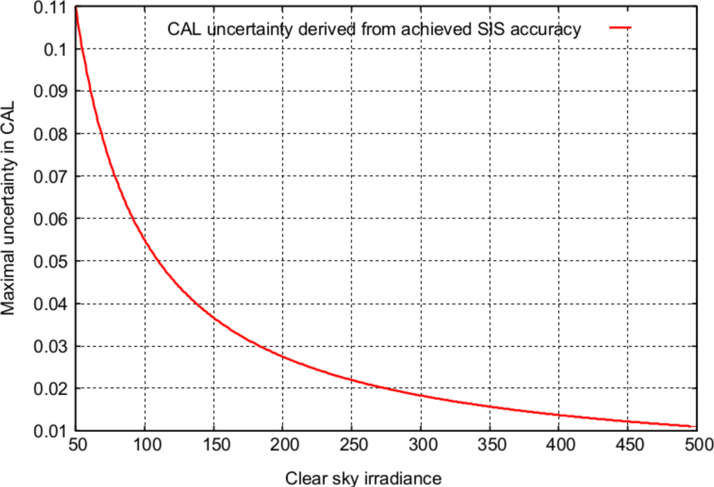 Hence, broadband observations are preferable for a consistent prolongation of the time series from the MVIRI instruments. A linear combination of the MSG/SEVIRI visible narrow-band channels (VIS006 and VIS008) provides a workaround as it simulates a broadband channel []. This approach has been shown to support a homogeneous retrieval of surface solar radiation between MFG and MSG []. Figure 4 provides the spectral response of the MVIRI broadband channel and the SEVIRI VIS006 and VIS008 channels. For consistency reasons CAL has been retrieved in 30 min resolution, which corresponds to the MVIRI temporal resolution. Further information on MSG and the SEVIRI instruments are given [].
