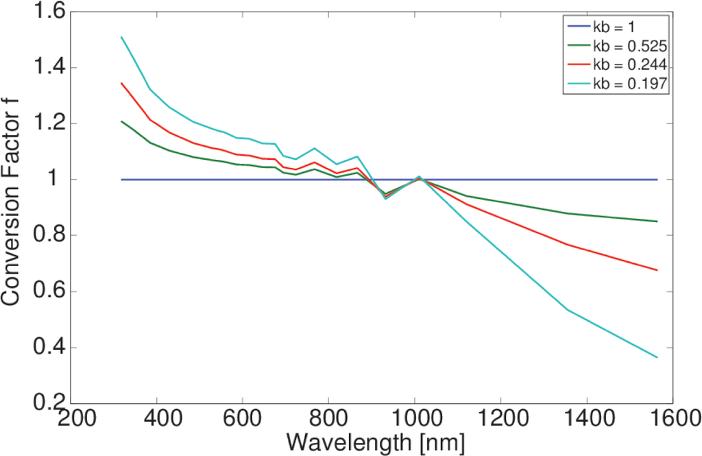The presence of clouds results in a shift of clear sky spectrum from the red towards the blue range. Hence, a conversion from the broadband cloud transmission given by kbb to a wavelength dependent transmission kλ is required. This is done by the calculation of conversion factors. These conversion factors are calculated for each wavelength band using Equation (7) in order to consider the spectral effect of clouds on the broadband transmission.