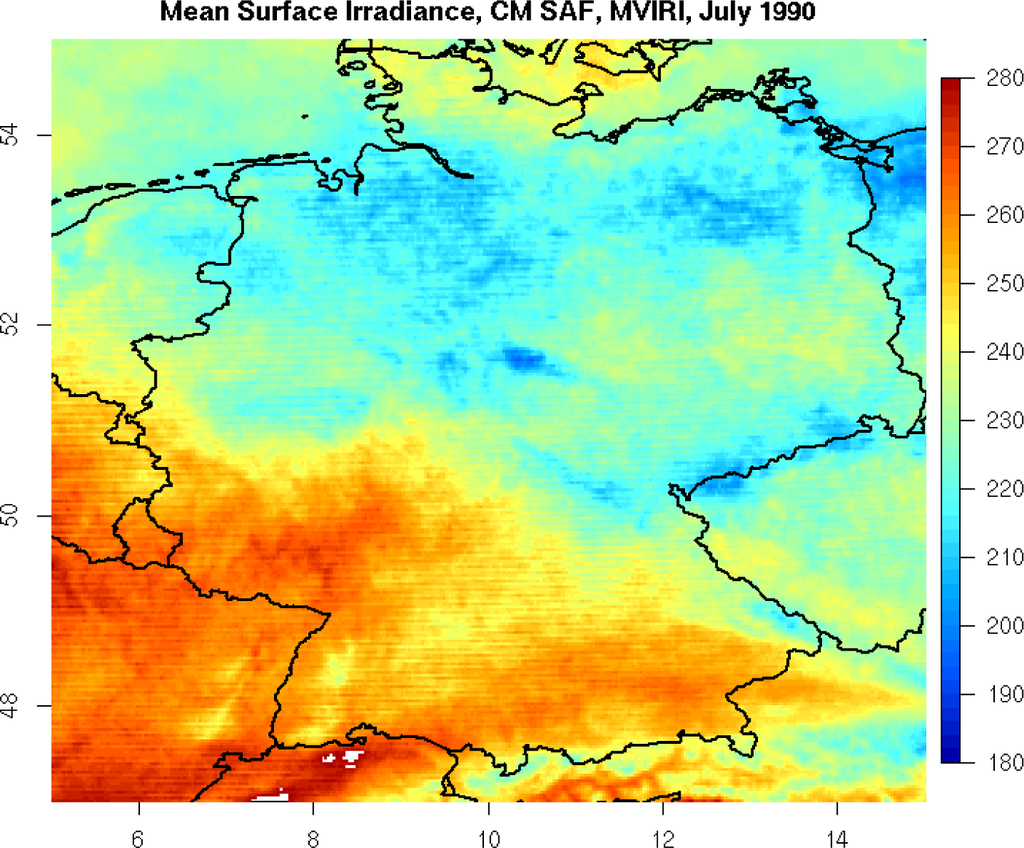 - DOI of CM-SAF MVIRI data set: 10.5676/EUM_SAF_CM/RAD_MVIRI/V001. 2011. Available online: http://dx.doi.org/10.5676/EUM_SAF_CM/RAD_MVIRI/V001 accessed on 17 June 2015.