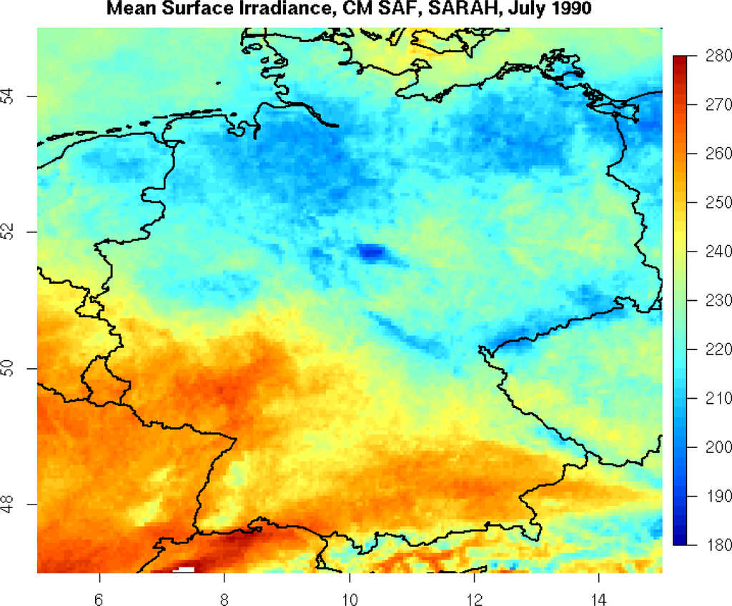 The CM-SAF contributes to the sustainable observing of the climate system by providing Essential Climate Variables [] related to the energy and water cycle of the atmosphere [,]. A central task of the CM-SAF is the generation of satellite based Climate Data Records (CDRs). A climate data record is a time series of sufficient length, consistency, and quality to determine climate variability and change. Climate data records (CDRs) of solar surface radiation and effective cloud albedo are needed for the monitoring of climate extremes and trends as well as for the analysis of the Earth Radiation budget. Moreover, these CDRs are well suitable for the verification of reanalysis data and regional climate models (e.g., [,]). Finally, CDRs of solar radiation are of importance for the satellite based estimation of droughts and evaporation []. CDRs of solar radiation from geostationary satellites are the primary source of observational data in regions where ground based measurements are rare (e.g., over ocean and on the African continent) and constitute a powerful addition even in regions with a dense network of ground measurements [].