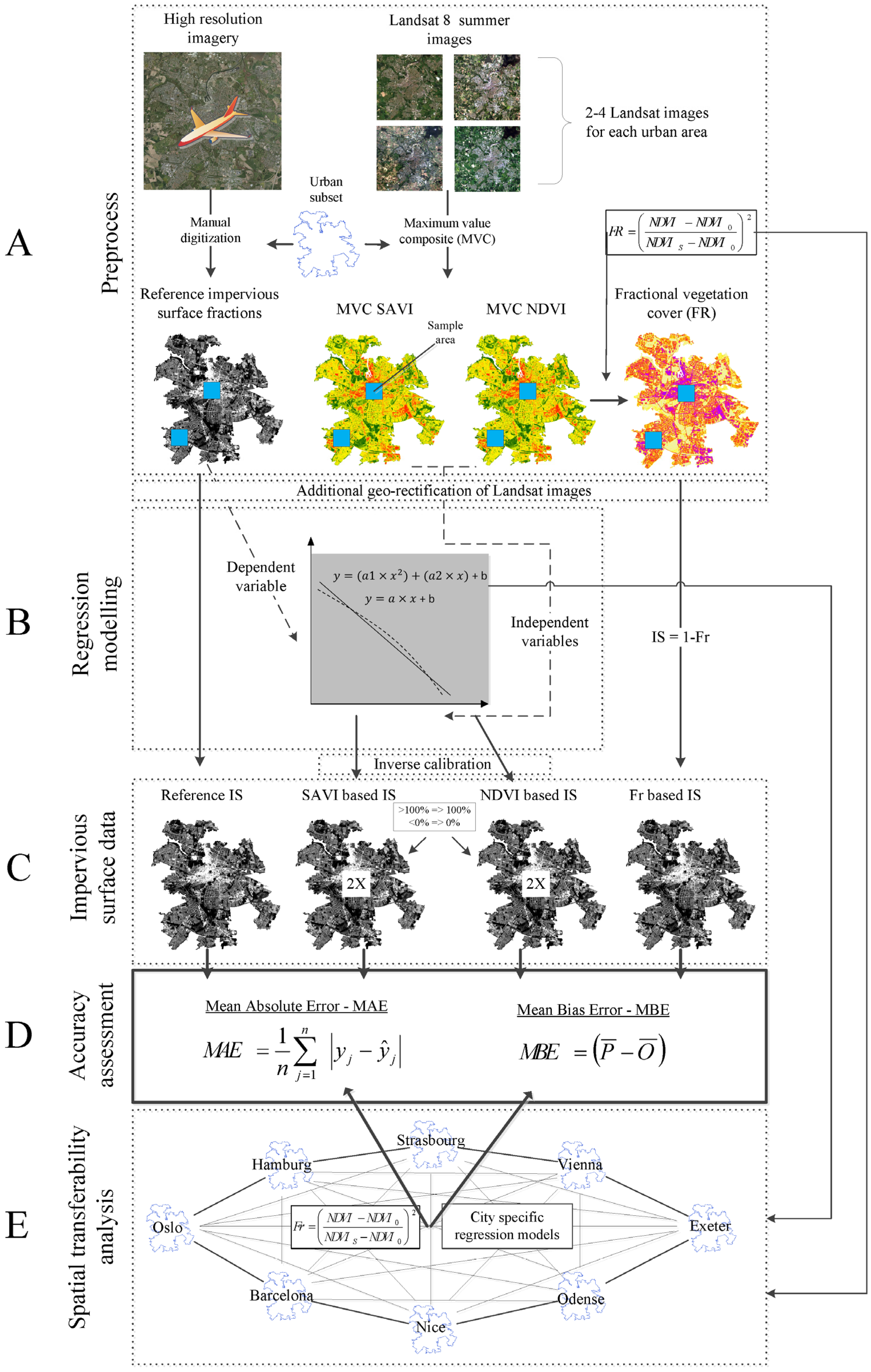 Flowchart of image processing and analyses procedures. (A) Preprocess, (B) Regression modelling, (C) Impervious surface data, (D) Accuracy assessment, (E) Spatial transferability analysis.