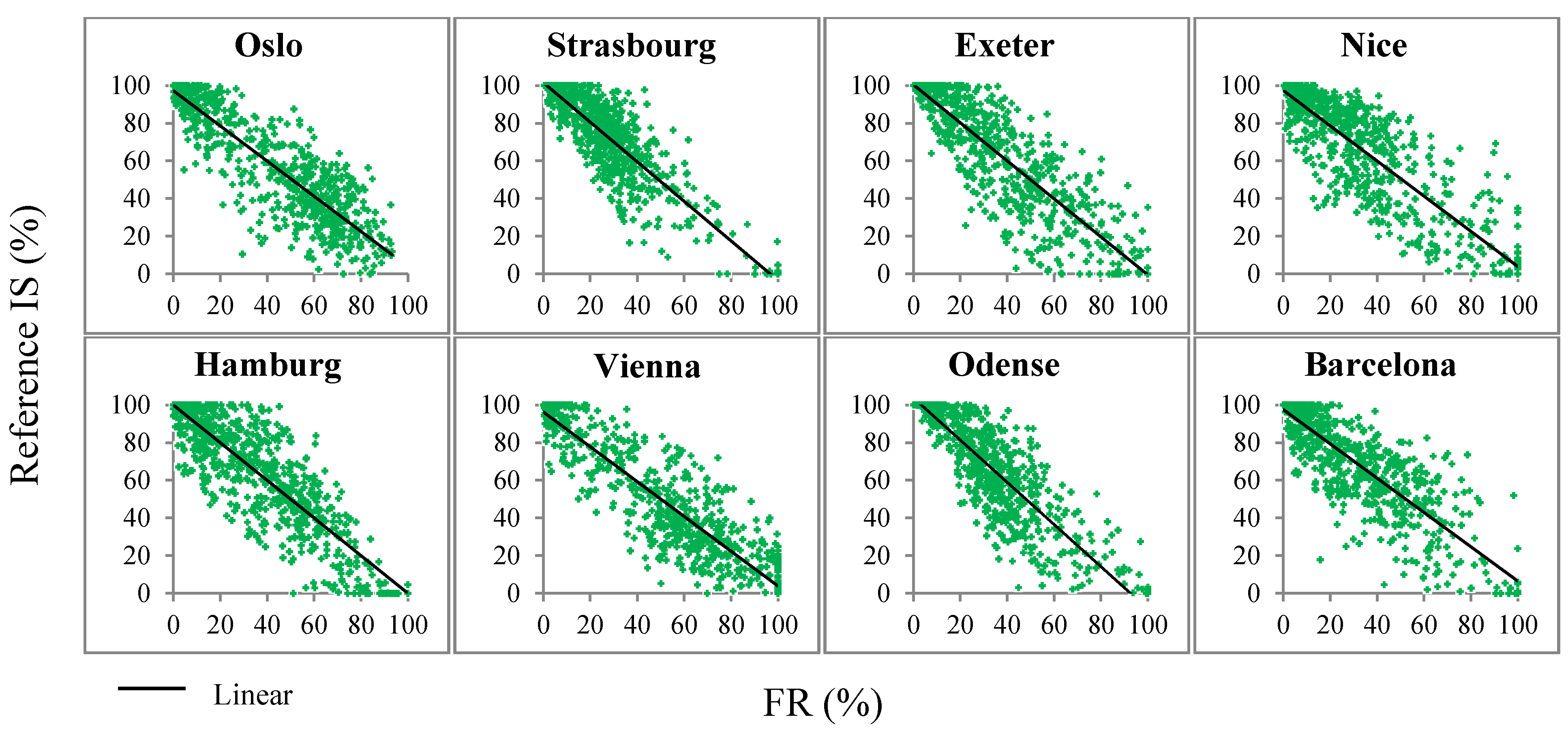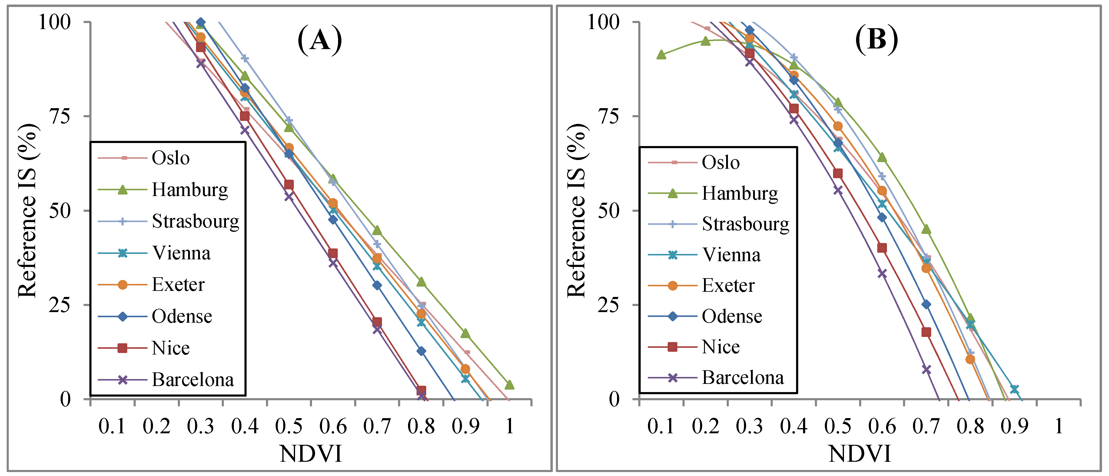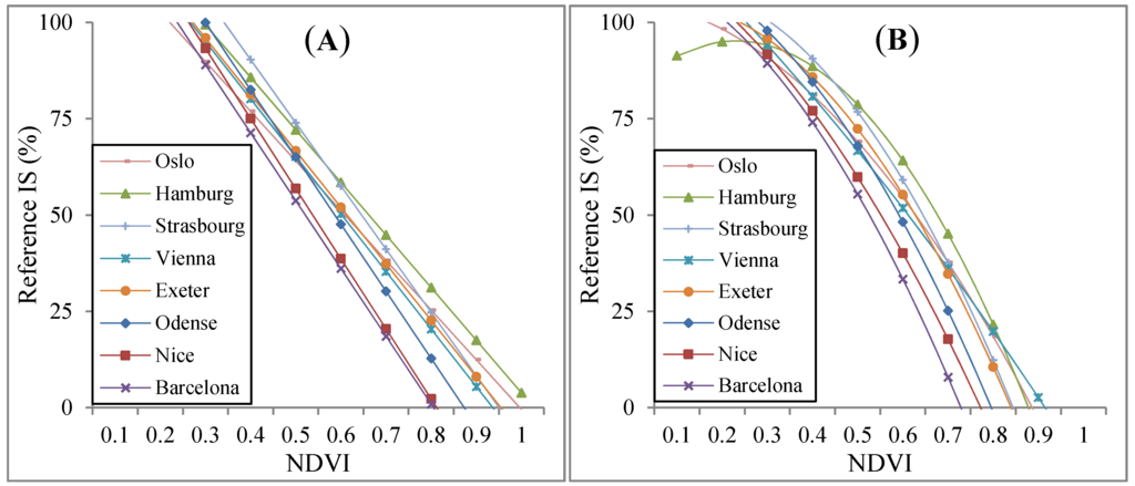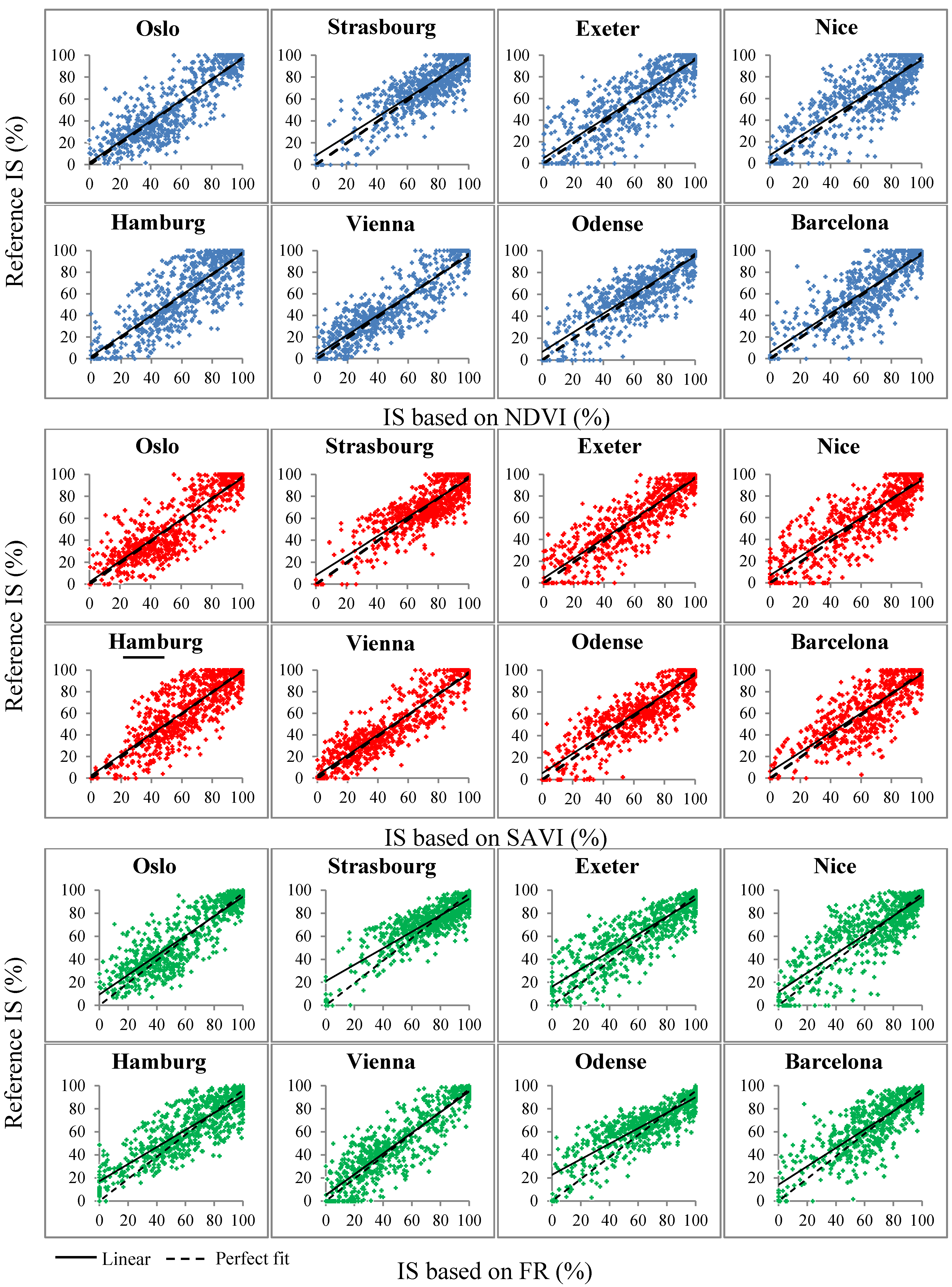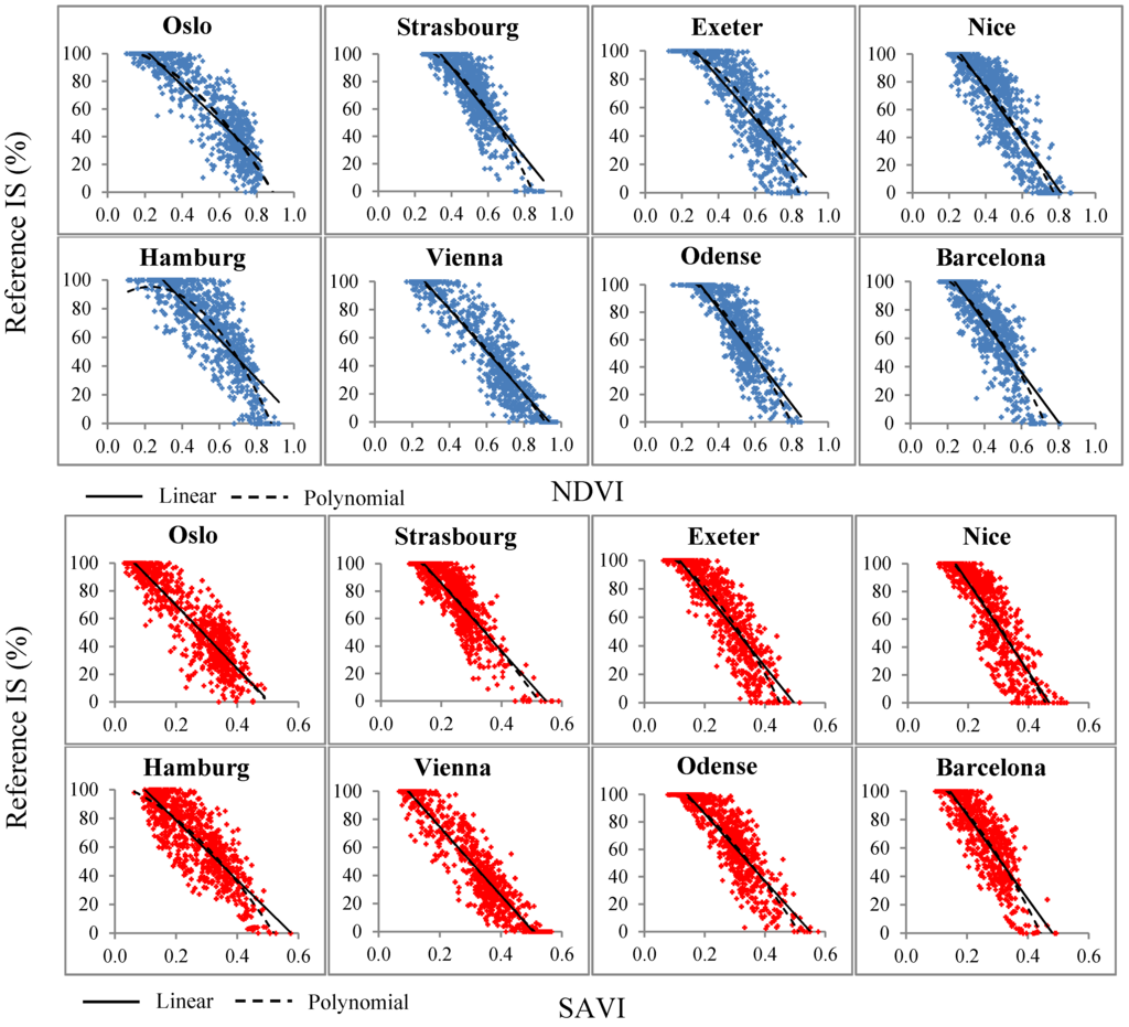For all eight cities, a strong inverse relationship between NDVI/SAVI and reference IS fractions was observed (Figure 4). Linear and second order polynomial regression models were both found to provide a good description of the relationship between NDVI/SAVI and reference IS fractions. The degree of non-linearity was seen to vary dependent on the vegetative conditions of the individual cities. Higher maximum NDVI and SAVI values were found in the urban areas located in the northern and central parts of Europe (Oslo, Hamburg, Strasbourg, Vienna, Exeter and Odense) as compared to those in southern Europe (Nice and Barcelona). Likewise, we observed a strong linear relation between IS fractions and FR for all the urban sub-areas (Figure 4), which confirms our assumption that bare soils are only marginally present within the selected urban sub-areas.